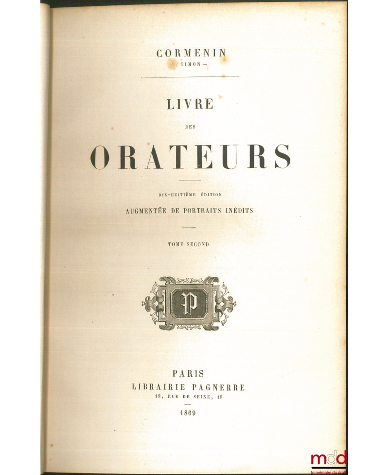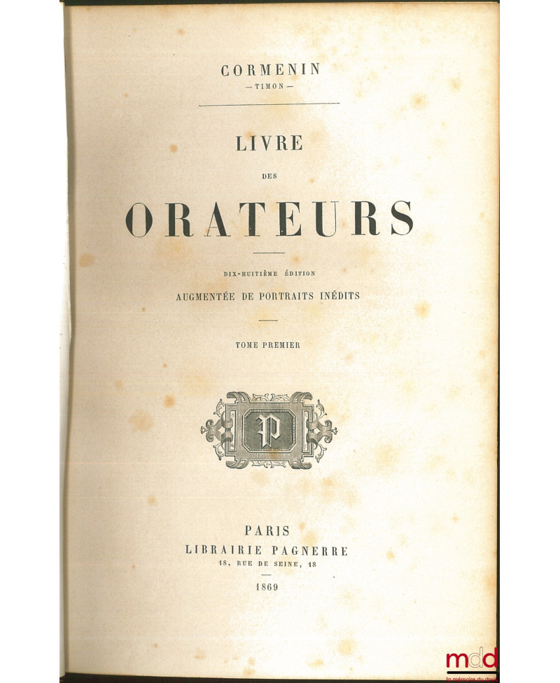 ŒUVRES DE CORMENIN : LIVRE DES ORATEURS, 18e éd. augmentée de portraits inédits