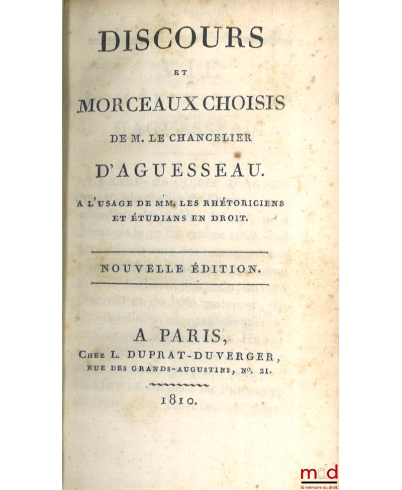 DISCOURS ET MORCEAUX CHOISIS DE M. LE CHANCELIER D’AGUESSEAU À l’usage de MM. les Rhétoriciens et Étudians en Droit, Nouvelle édition