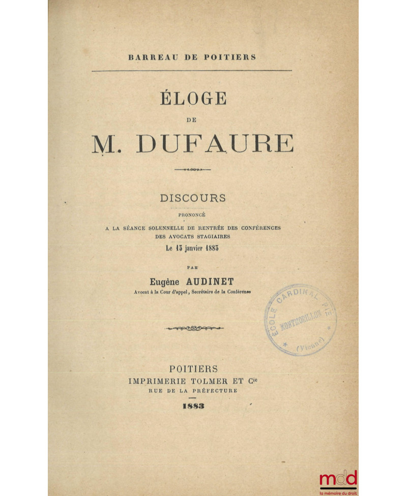 Volume qui rassemble les discours et conférences suivants : Eugène Audinet, Éloge de M. Dufaure ; Henry Taudière, Éloge du Chancelier d’Aguesseau ; Albert Daubin, Les lois relatives à la protection de l’enfance ; Alfred Jarrassé, De la recherche de la paternité naturelle ; Victor Boisseau, Éloge de Faustin Hélie ; Louis Morillon, Le barreau de Poitiers depuis 1810 ; Eugène Meschin, Des syndicats professionnels ; Joseph de Villedon, Éloge de Demolombe ; Jean de Veillechèze de la Mardière, Du système répressif et de la poursuite criminelle en Angleterre ; Charles Pichot, Allocution prononcée le 26 janvier 1889 à la réouverture des conférences des avocats stagiaires du barreau de Poitiers ; Paul Fontant, L’avocat au civil ; Paul Mercier, De la faillite au point de vue de l’économie politique et de la législation comparée ; Charles Bernaud, De l’avocat au criminel ; Charles Couillault, De la responsabilité des accidents dont les ouvriers sont victimes dans leur travail ; Paul Druet, Allocution prononcée le 20 décembre 1890 à la séance de rentrée des conférences du stage ; M. David, Des rapports entre le capital et le travail, Des relations entre les patrons et les ouvriers ; Urbain Deleffe, De l’extension de la compétence des juges de paix ; Maurice Morand, De l’application des peines en cours d’assises ; Paul Robain, L’assistance judiciaire au barreau.