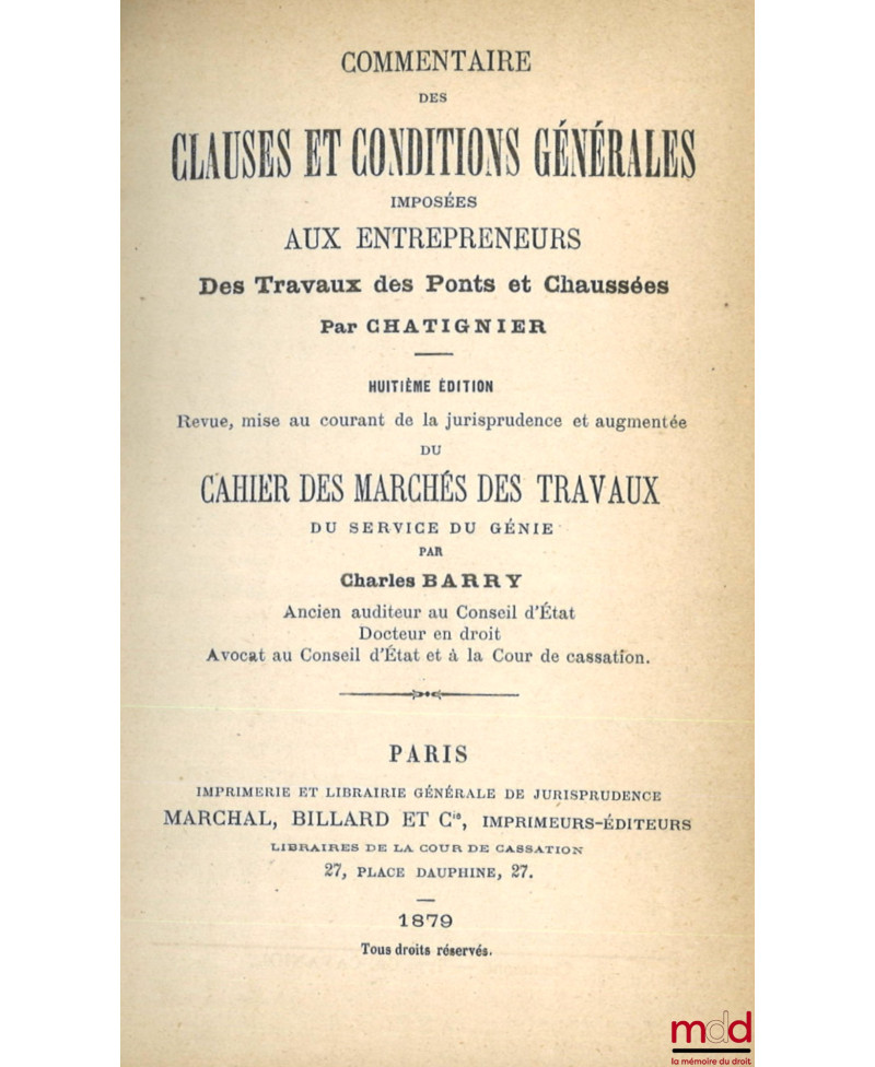 COMMENTAIRE DES CLAUSES ET CONDITIONS GÉNÉRALES IMPOSÉES AUX ENTREPRENEURS DES TRAVAUX DES PONTS ET CHAUSSÉES, 8e éd. revue, mise au courant de la jurisprudence et augmentée du Cahier des marchés des travaux du service du génie par Charles Barry