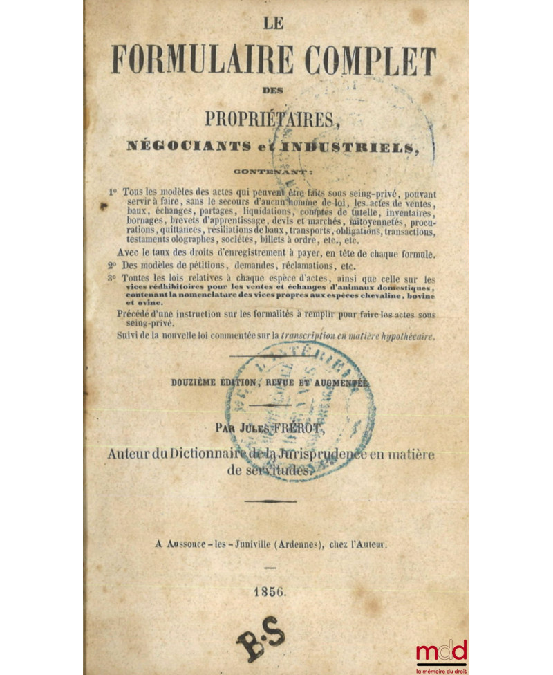 LE FORMULAIRE COMPLET DES PROPRIÉTAIRES, NÉGOCIANTS ET INDUSTRIELS, Contenant : 1° Tous les modèles des actes qui peuvent être faits sous seing-privé (...), 2° Des modèles de pétitions, demandes, réclamations, etc., 3° Toutes les lois relatives à chaque espèce d’actes, ainsi que celle sur les vices rédhibitoires pour les ventes et échanges d’animaux domestiques, contenant la nomenclature des vices propres aux espèces chevaline, bovine et avine., Précédé d’une instruction sur les formalités à remplir pour faire les actes sous seing-privé., Suivi de la nouvelle loi commentée sur la transcription en matière hypothécaire, 12e éd., revue et augmentée par J. Frérot