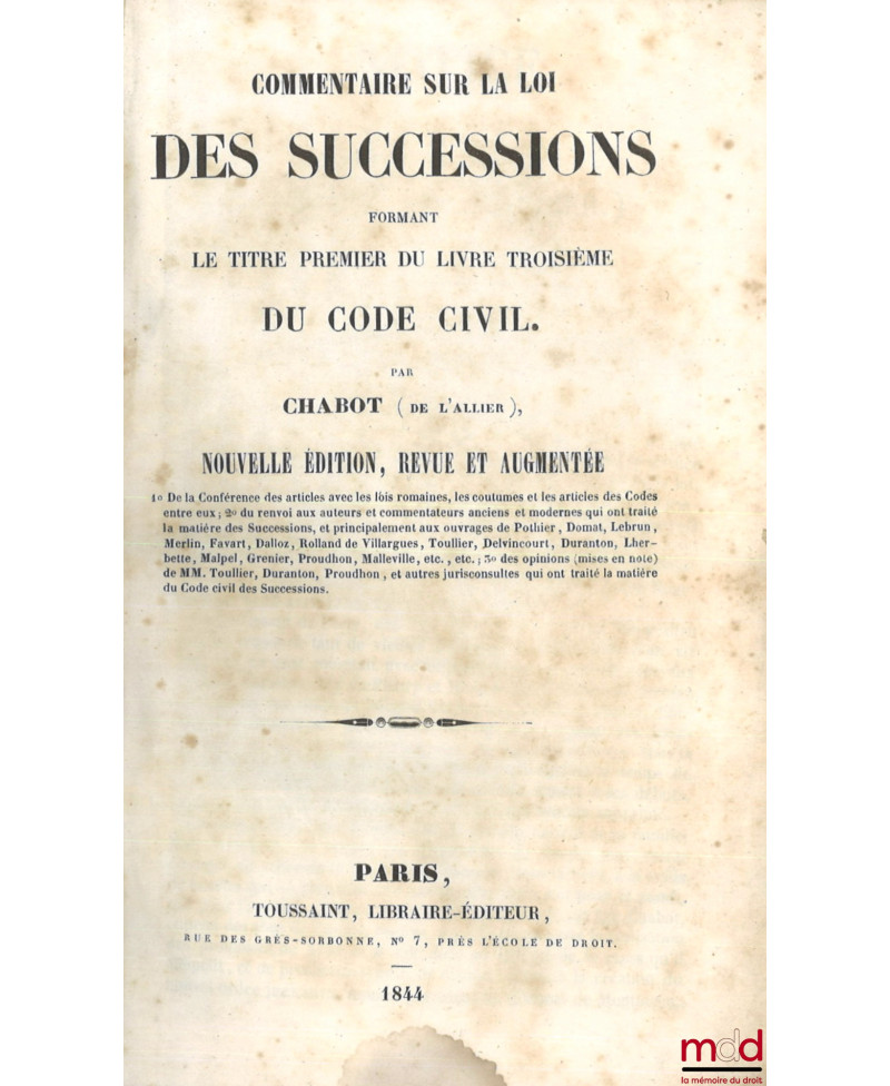 L’ouvrage constitue l’un des tout premiers commentaires des dispositions du Code civil relatives aux successions et connut un vif succès dans le public. La 5e édition ici présentée est considérablement enrichie par rapport aux premiers tirages, c’est également la dernière publiée du vivant de l’auteur. Selon Dupin elle doit être préférée aux précédentes. (Dupin n° 1416, Dramard n° 1387).