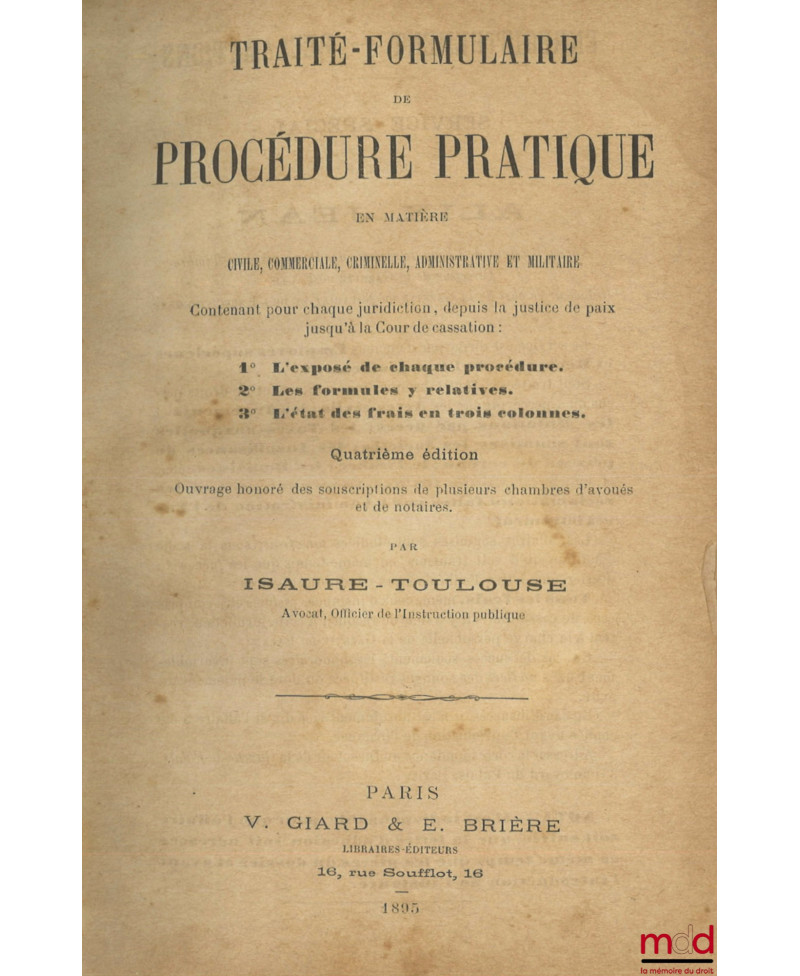 TRAITÉ-FORMULAIRE DE PROCÉDURE PRATIQUE EN MATIÈRE CIVILE, COMMERCIALE, CRIMINELLE, ADMINISTRATIVE ET MILITAIRE Contenant pour chaque juridiction, depuis la justice de paix jusqu’à la Cour de cassation : 1° L’exposé de chaque procédure ; 2° Les formules y relatives ; 3° L’état des frais en trois colonnes., 4e éd.