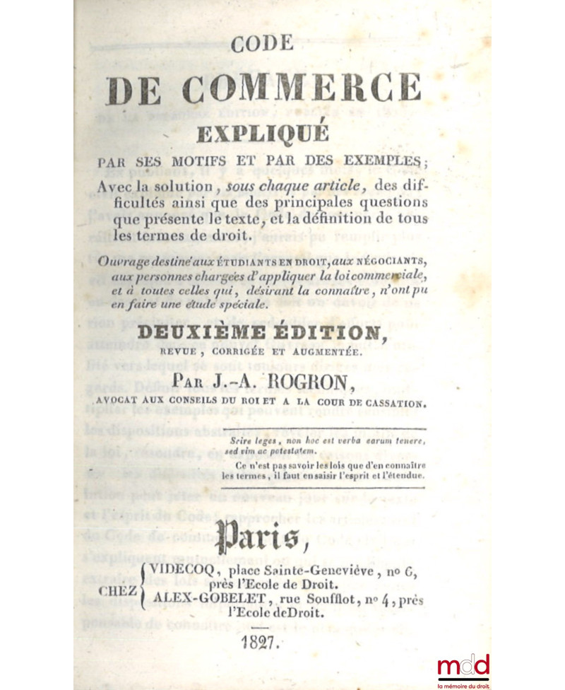 Commentateur très impliqué à chaque parution des codes, le commentaire du Code de commerce, dont la première édition remonte à 1825, n’échappe pas à J.-A. Rogron.