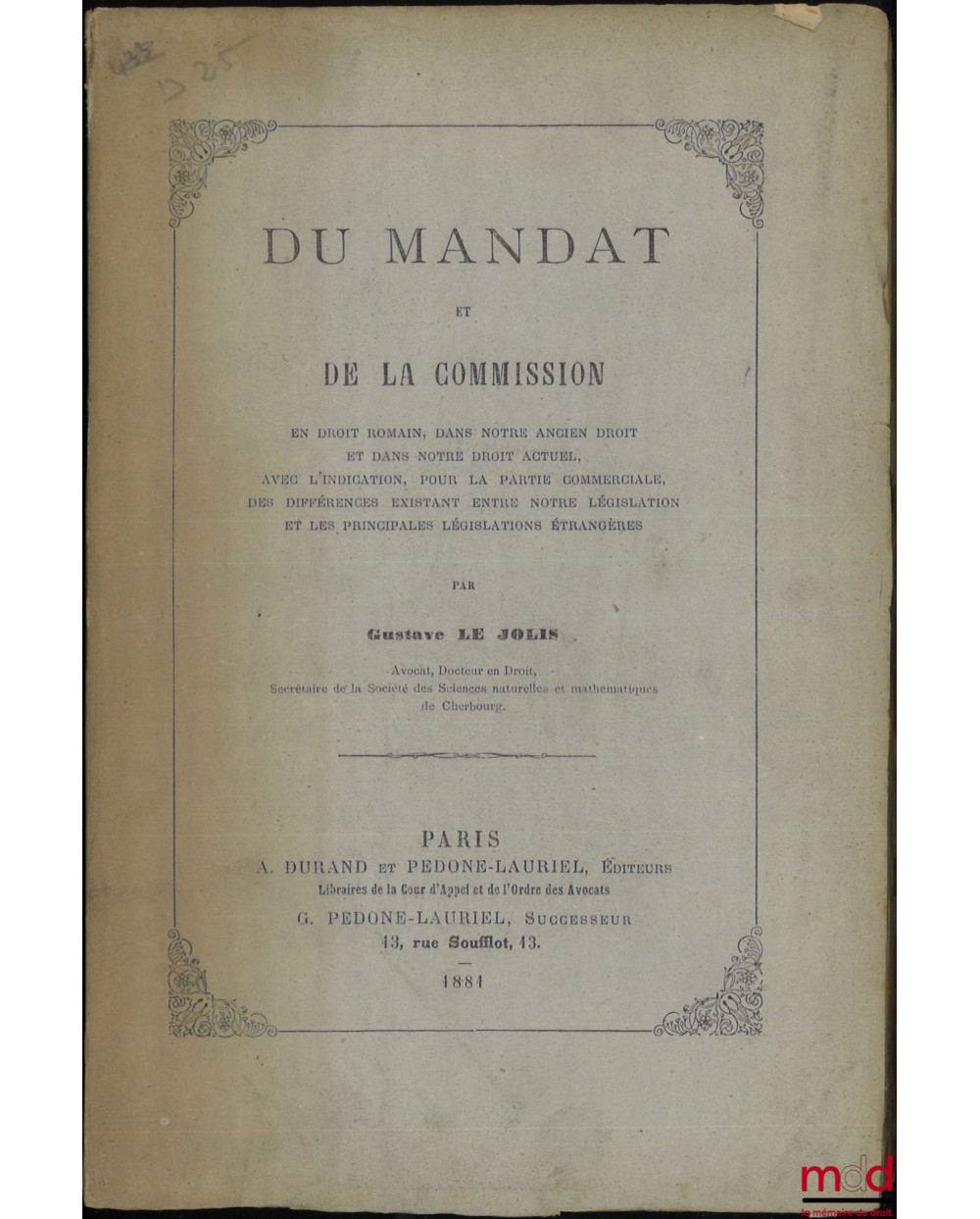 DU MANDAT ET DE LA COMMISSION en droit romain, dans notre ancien droit et dans notre droit actuel, avec l’indication, pour la partie commerciale, des différences existant entre notre législation et les principales législations étrangères