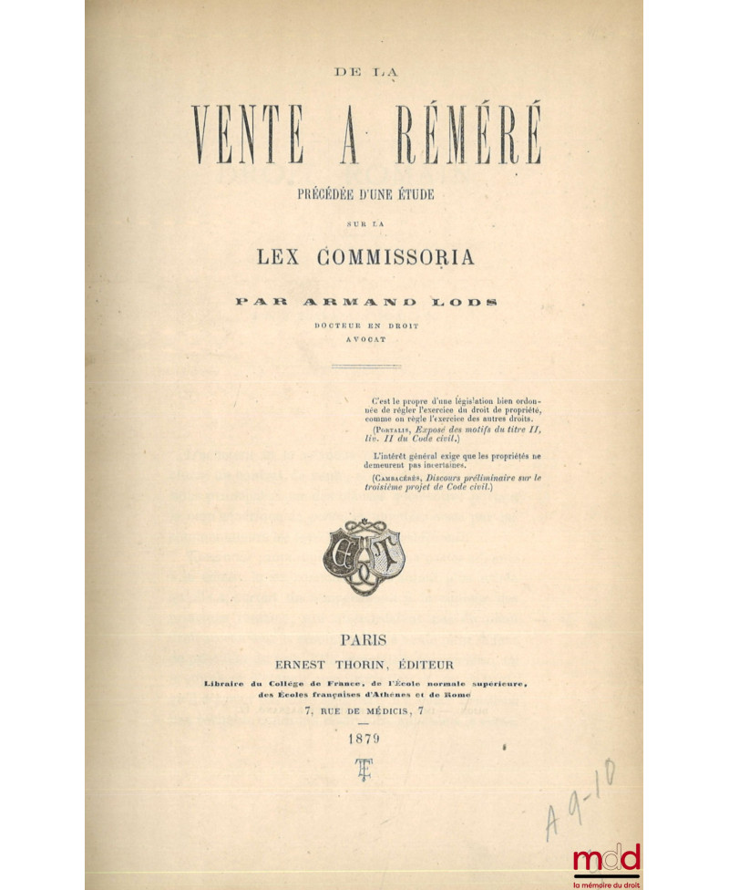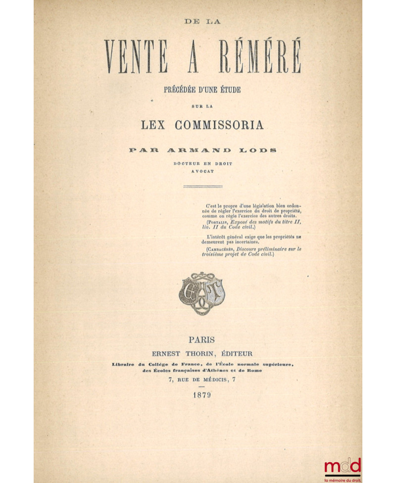 DE LA VENTE À RÉMÉRÉ, Précédée d’une étude sur la Lex Commissoria