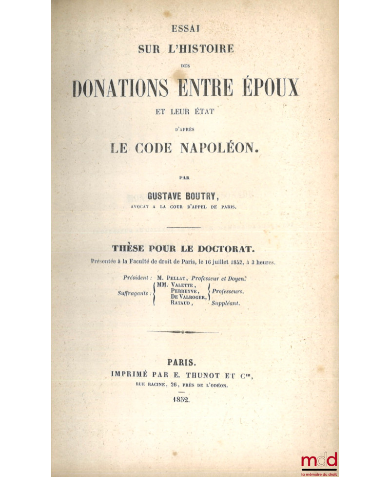 ESSAI SUR L’HISTOIRE DES DONATIONS ENTRE ÉPOUX ET LEUR ÉTAT D’APRÈS LE CODE NAPOLÉON