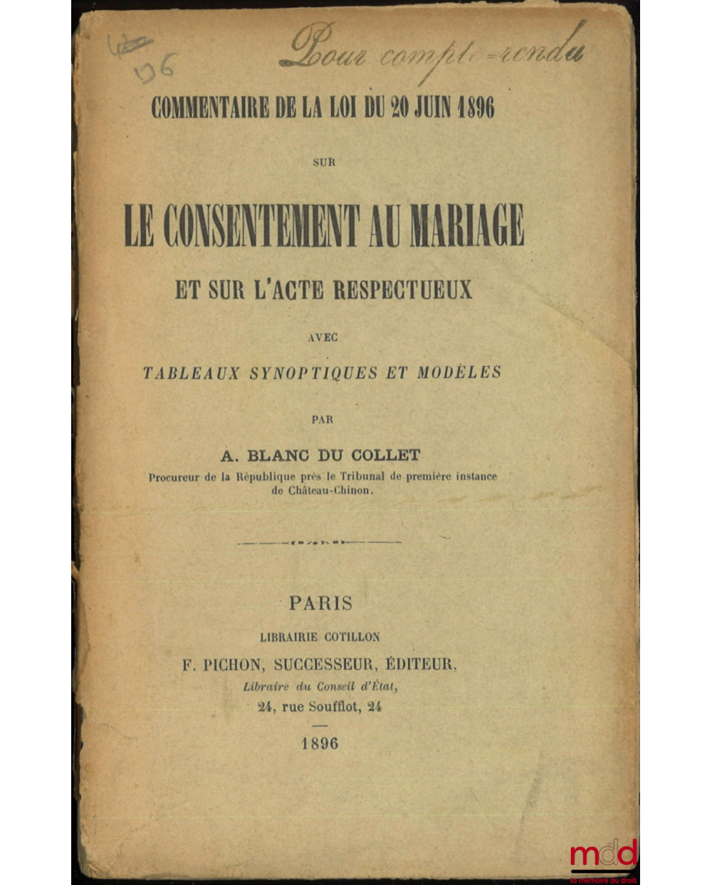 COMMENTAIRE DE LA LOI DU 20 JUIN 1896 SUR LE CONSENTEMENT AU MARIAGE ET SUR L’ACTE RESPECTUEUX, Avec tableaux synoptiques et modèles