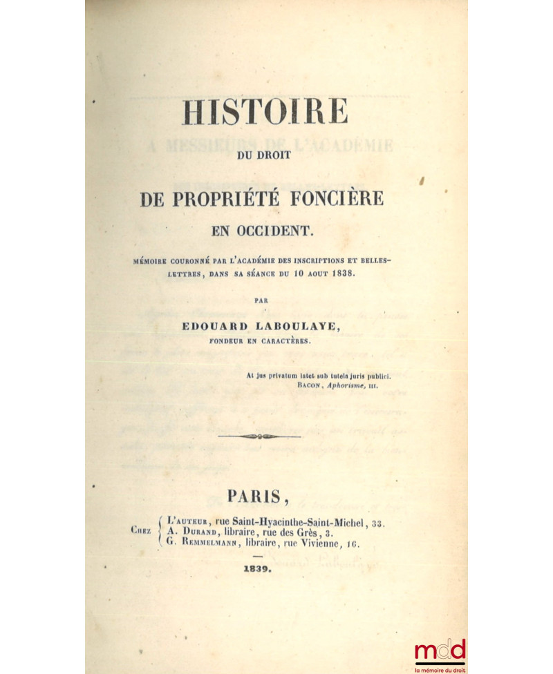 Ouvrage qui se découpe en deux parties : la première, L’Histoire dix Droit de Propriété chez les Romain ; la seconde, L’Histoire du Droit de Propriété chez les Barbares jusqu’à l’établissement des fiefs. Dans la première partie on remarquera « des points particulièrement intéressants, notamment les chapitres qui traitent de la Distinction de la Propriété et de la Possession, de l’Organisation municipale des derniers temps de l’Empire, de L’Origine du Colonat, institution qui a eu sur le développement du servage une influence encore peu connue, des Lois Julia et Papia Poppœa qui ont bouleversé toute la législation des successions, et ont régné en souveraines pendant presque toute la durée de l’empire. (…) Après quelques considérations sur les premiers Germains, l’auteur examine comment se fil la conquête. Dans l’opinion de l’auteur ce fut moins une invasion du dehors qu’une sorte de prise de possession. Les Barbares s’étaient établis au cœur de l’empire en ruines, et, sous le nom d’auxiliaires et de fédérés, ils en étaient déjà les maîtres. Dans le livre suivant, qui est le sixième, M. Laboulaye expose quelle fut la condition des hommes et des propriétés libres ; il nous montre chaque propriétaire d’alleux souverain dans son domaine et soumis seulement aux trois grandes obligations du canton, l’assemblée ou plaid, la fonction de juge de ses pairs de la guerre ; il nous explique ensuite comment les petits alleux disparurent par l’effet des vassalités, et, à cette occasion, il reprend en sous-œuvre le beau travail de M. Guizot, et expose ce que c’était que la Recommandation et le Précaire ; il essaie de prouver que la Recommandation était la forme même de la vassalité et non point une institution différente, comme paraît l’avoir pensé l’illustre historien. Dans le septième livre l’auteur revient sur cette question des vassalités ; il nous peint sous un triple aspect le roi barbare : chef militaire pour les hommes libres, espèce de préfet romain pour les anciens habitants, seigneur féodal pour tous les hommes qui se sont faits ses vassaux, et il nous montre comment cette dernière qualité finit, par absorbe) : les deux autres, Viennent ensuite les immunités et surtout les immunités ecclésiastiques à qui nous devons peut être la renaissance des villes et la conservation de la civilisation. M. Laboulaye explique ce qu’on doit entendre parle mot de bénéfice, expression complexe qui a été lu cause de grandes méprises historiques, faute de s’être rendu en compte exact des idées différentes que ce mot a exprimées ; H nous dit également cruelle fui lu condition des bénéficiaires : comment ces bénéfices firent la grandeur el la fortune des maires du palais ; comment enfin ces bénéfices, devenus héréditaires et changés en fiefs, amenèrent la féodalité. Le sujet, on le voit, tient au cœur même de l’histoire de France, et sert de supplément nécessaire à tous les ouvrages où l’on s’est borné au récit des faits. Le huitième livre traite de la propriété germaine dans ses rapports avec le droit privé, c’est-à-dire des différents caractères légaux de la propriété, et des formes suivant lesquelles elle se transmettait ; le dernier chapitre nous montre comment l’alleu s’est transformé en fief sans perdre son caractère, et comment il a été vrai de dire que la couronne de France (alleu devenu fief) devait se gouverner par la loi salique qui était la loi des alleux. Le neuvième livre nous dépeint la famille germaine, la tutelle des femmes, le Régime des biens durant le mariage, le Douaire, le Morgengabe ou don du matin que le mari donnait à la femme pour prix de sa virginité, in pretium pulchritudinis, la Dot, etc. L’auteur nous dit ensuite en quels points la succession chez les Germains différait de la succession romaine, différence qui subsiste encore dans nos législations modernes. Il nous expose l’origine de la Représentation, qui ne fut admise qu’à la suite d’un combat ordonné par l’empereur Othon, combat dans lequel le champion des neveux renversa le champion de l’oncle, à la grande satisfaction de tous les neveux futurs ; il explique enfin comment sous l’influence des idées romaines, on en vint, à l’aide des formules, à introduire l’usage des testaments, usage antipathique au génie germain, qui ne reconnaissait qu’à Dieu seul le droit de faire un héritier. Enfin, dans un dernier livre qui n’est pas le moins curieux de l’ouvrage, l’auteur о mis à contribution le Polyptique ďlrminon, publié, il y a quelques années, par notre savant confrère, M. Guérard, pour nous dire quelle fut la condition des serfs à cette époque de confusion qui précède la féodalité. Toute cette partie entièrement neuve est d’un puissant intérêt. Ou voit déjà dans celle condition misérable, le germe d’un meilleur avenir ; on sent que le christianisme a passé par là, et que, tandis que les Romains, pendant huit siècles, n’ont vu clans l’esclave qu’une chose, les Barbares, sous l’influence des idées religieuses, ont fait de l’esclave un homme et presqu’un compagnon. »