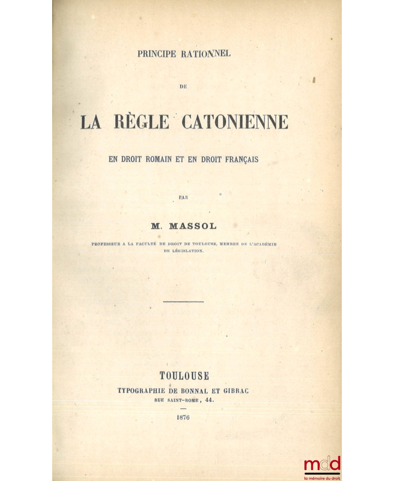 PRINCIPE RATIONNEL DE LA RÈGLE CATONIENNE En droit romain et en droit français