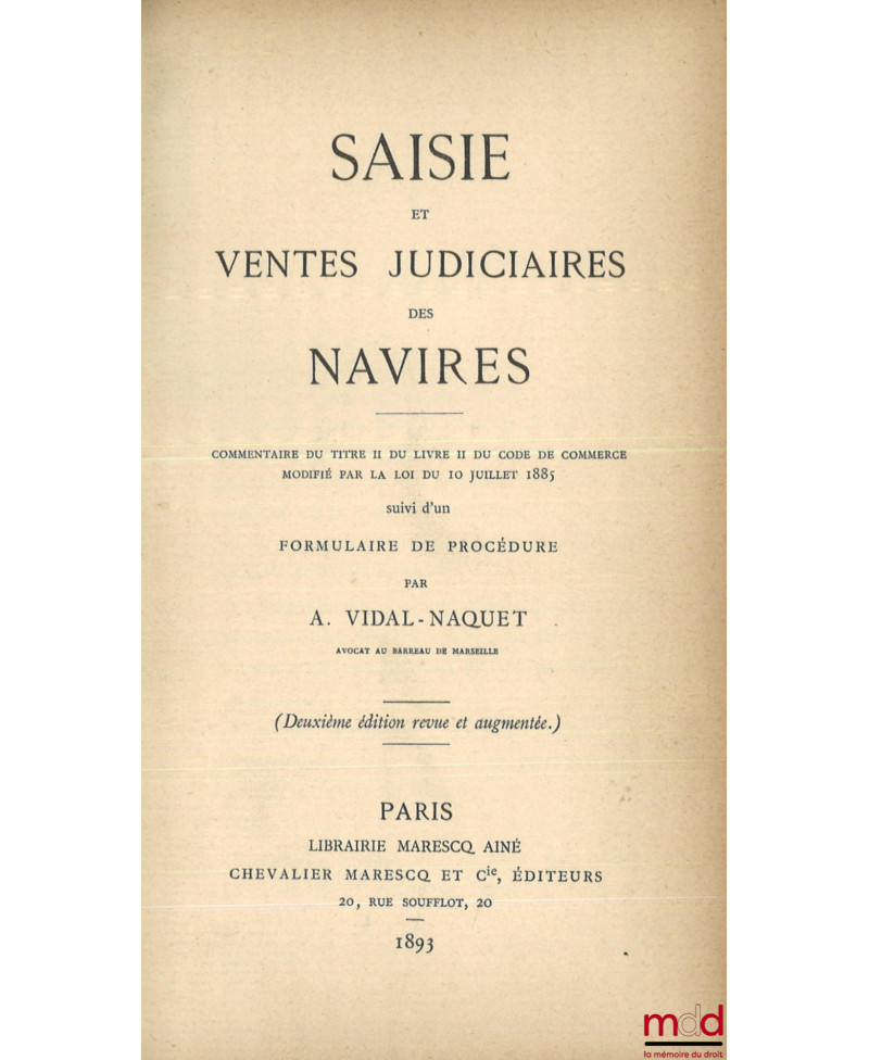 SAISIE ET VENTES JUDICIAIRES DES NAVIRES, Commentaire du titre II du livre II du Code de commerce modifié par la loi du 10 juillet 1885 suivi d’un Formulaire de procédure, 2e éd. revue et augmentée