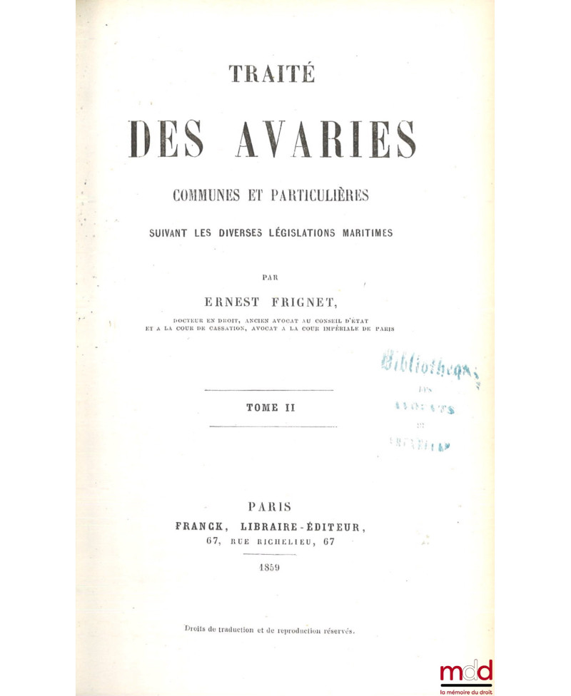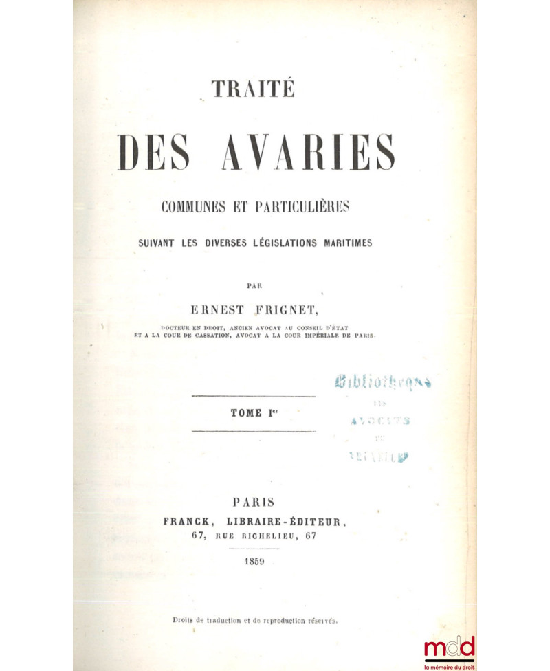 TRAITÉ DES AVARIES Communes et particulières suivant les diverses législations maritimes