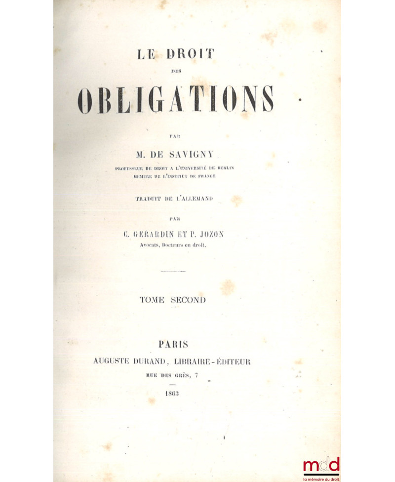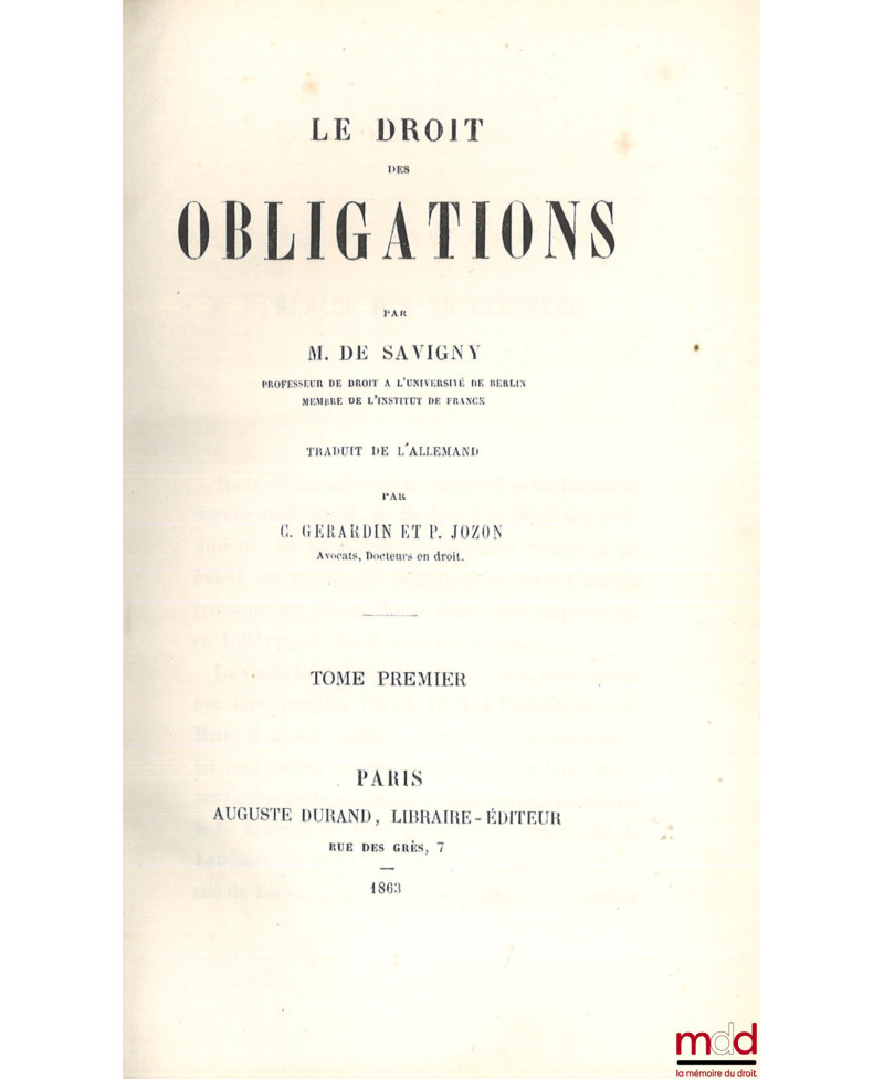 LE DROIT DES OBLIGATIONS, Traduit de l’allemand par C. Gérardin et P. Jozon