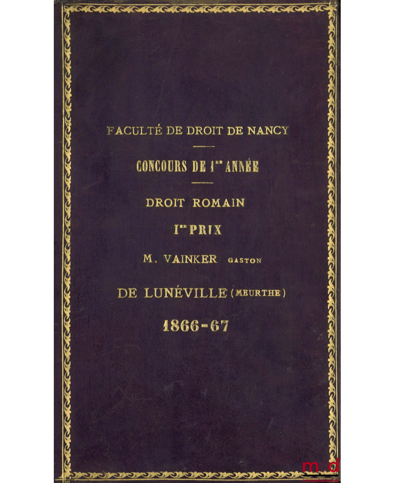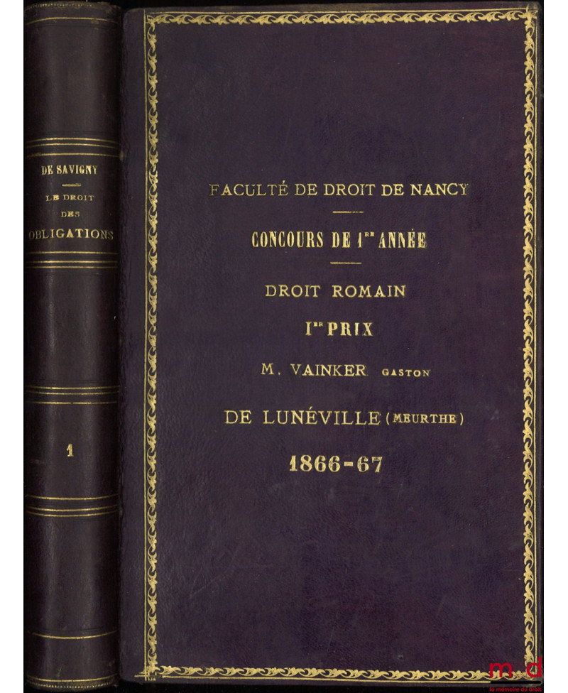 - 2 vol. in-8, pl. rel. en maroquin aubergine, tit. et tom. dorés sur dos lisse orné de filets soulignants dorés et estampés à froid, plats encadrés d’un filet doré et d’une frise dorée, Livre de prix de la Faculté de droit de Nancy : « Concours de 1re année, Droit romain, 1er prix, M. Vainker Gaston, de Luneville (Meurthe), 1866-1867 », tr. mouchetées, (de légères épidermures, qq. impacts sur le t. II, qq. rousseurs et mouillures à l’int.), bel exemplaire et bon état, XII-438 / 484 p.