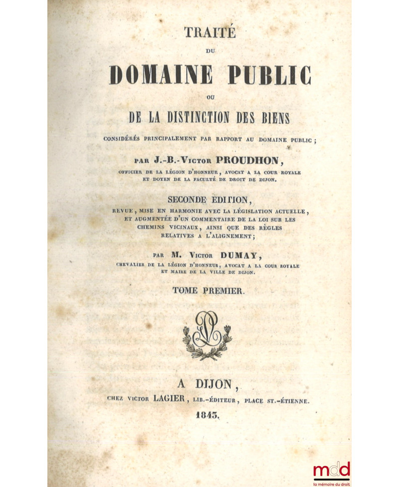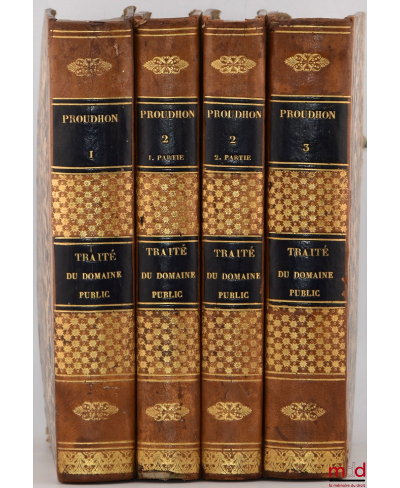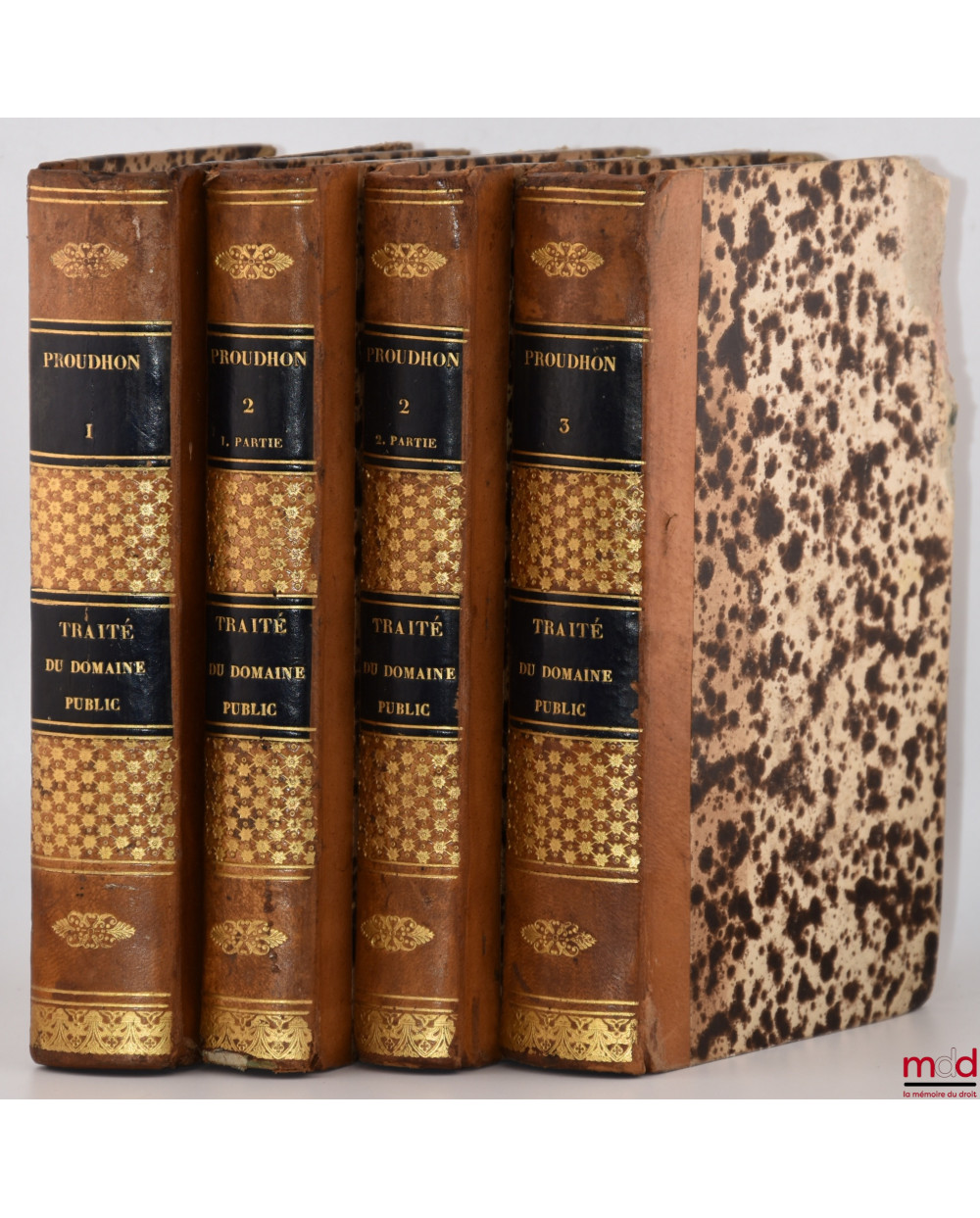 (Dramard n° 851). Il n’est guère utile de présenter ce texte dont Chapus rappelle (D.A.G., t. II, n° 382) qu’il contient « la plus étudiée et la plus notoire des premières mises en forme de la distinction » [entre domaine public et domaine privé]. Proudhon est le fondateur de la thèse selon laquelle le domaine public n’est pas la propriété des personnes publiques qui ne détiennent sur lui qu’un droit de garde. Il est par ailleurs le premier auteur à admettre la possibilité d’un domaine public des collectivités locales, et spécialement des communes. Seule édition française (une édition belge en 2 volumes parait en 1835) de ce texte majeur qui, bien qu’écrit par un civiliste, constitue probablement la meilleure source du XIXe siècle pour l’étude sur le droit administratif des biens. Les manuels récents du droit administratif rappellent encore sa place dans la controverse sur le caractère de propriété ou non de la domanialité publique.
