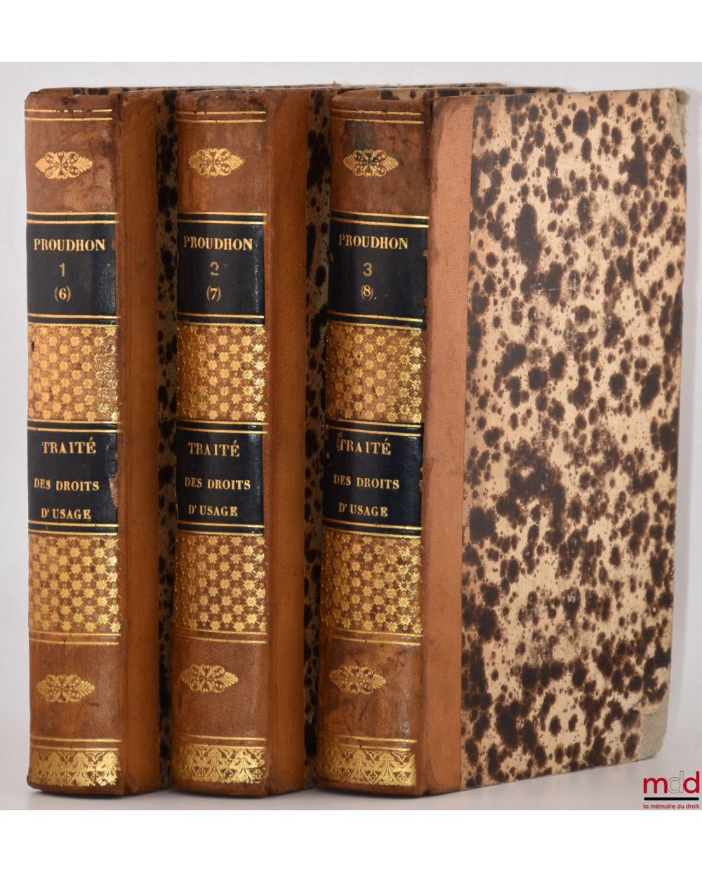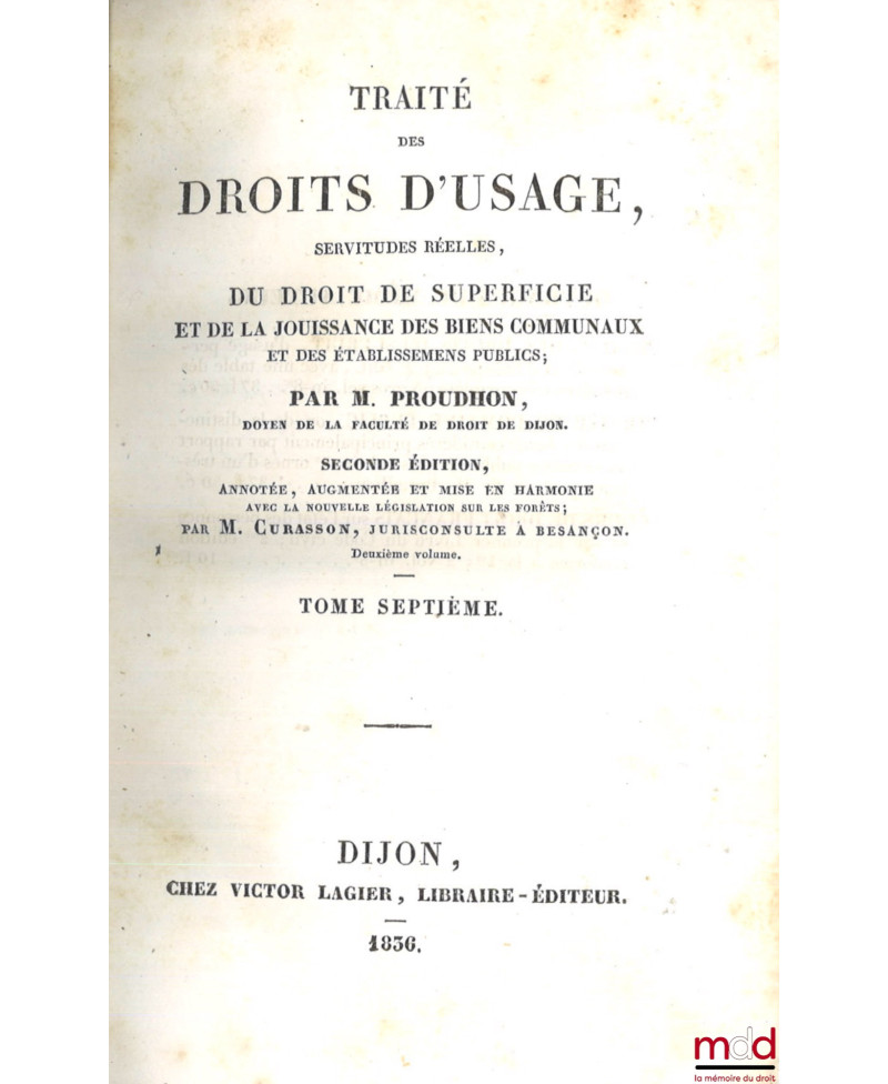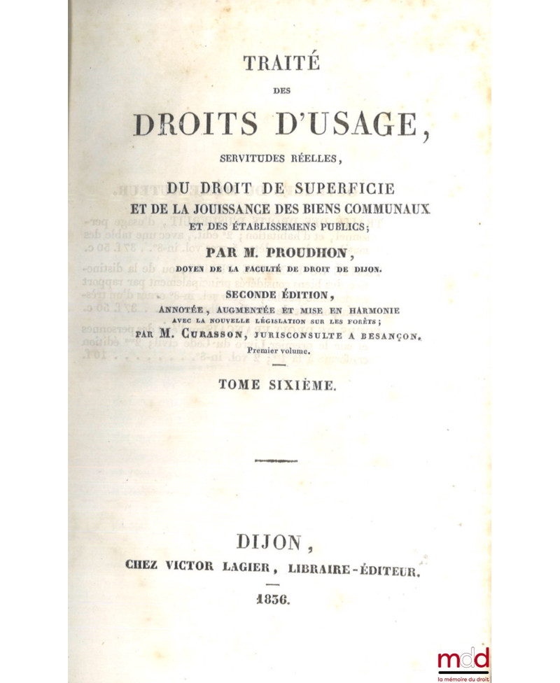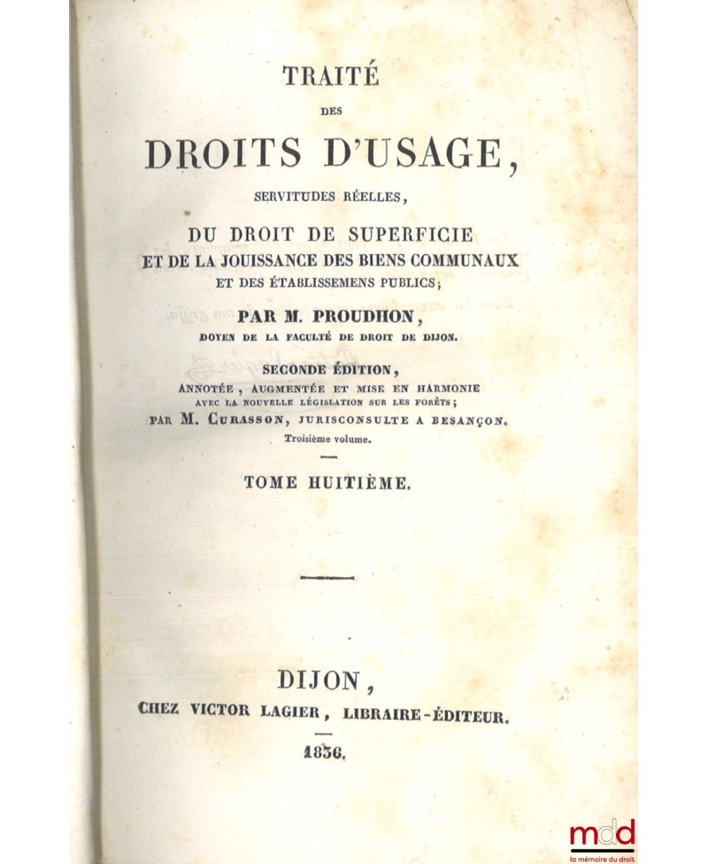 TRAITÉ DES DROITS D’USAGE, SERVITUDES RÉELLES, DU DROIT DE SUPERFICIE ET DE LA JOUISSANCE DES BIENS COMMUNAUX ET DES ÉTABLISSEMENTS PUBLICS, 2e éd. annotée, augmentée et mise en harmonie avec la nouvelle législation sur les forêts par M. CURASSON, [complet : t. I, II et III seuls Des droits d’usage]