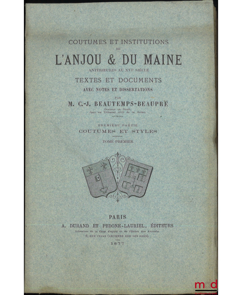 COUTUMES ET INSTITUTIONS DE L’ANJOU & DU MAINE antérieures au XVIe siècle, Textes et documents avec notes et dissertations. Première Partie : Coutumes et Styles (4 vol.) ; Seconde Partie : Recherches sur les Juridictions de l’Anjou & du Maine pendant la période féodale (5 vol.), Préface de l’auteur (1 vol.)