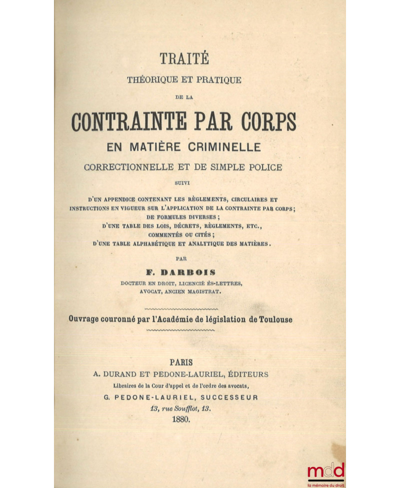 TRAITÉ THÉORIQUE ET PRATIQUE DE LA CONTRAINTE PAR CORPS EN MATIÈRE CRIMINELLE, CORRECTIONNELLE ET DE SIMPLE POLICE, Suivi d’un appendice contenant les règlements, circulaires et instructions en vigueur sur l’application de la contrainte par corps ; de formules diverses ; d’une table des lois, décrets, règlements, etc., commentés ou cités ; d’une table alphabétique et analytique des matières.