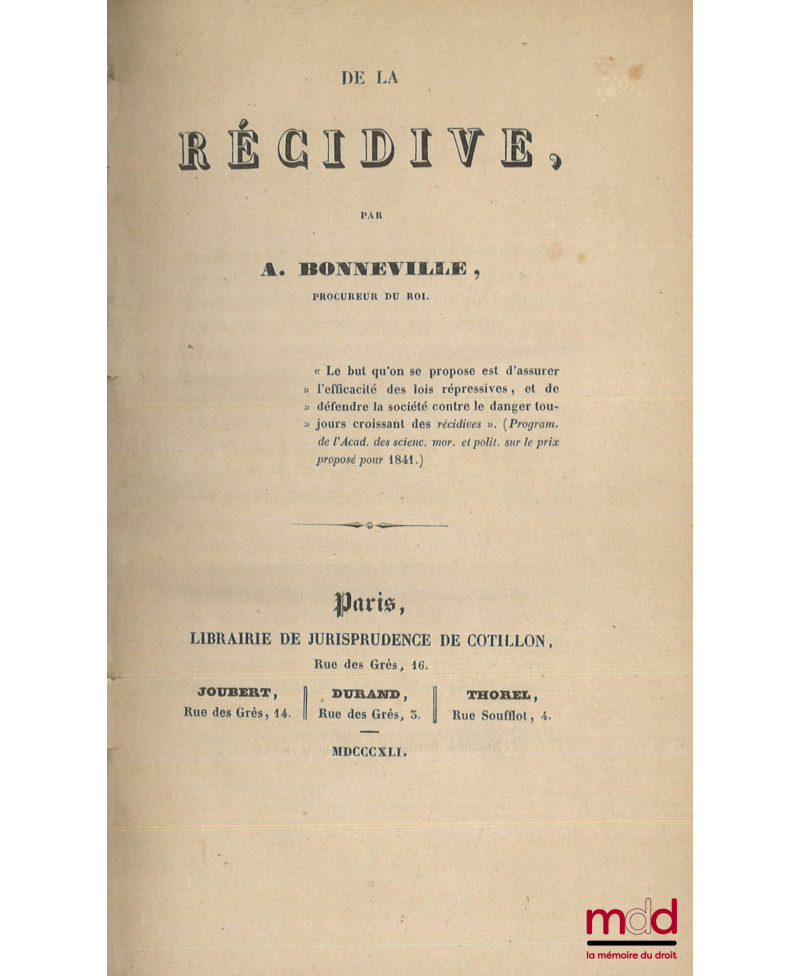 DE LA RÉCIDIVE, [Suivi de] DE LA RÉCIDIVE d’après la loi des 18 avril - 13 mai 1863, Commentaire des nouveaux articles 57 et 58 du Code pénal par Théophile Bazot