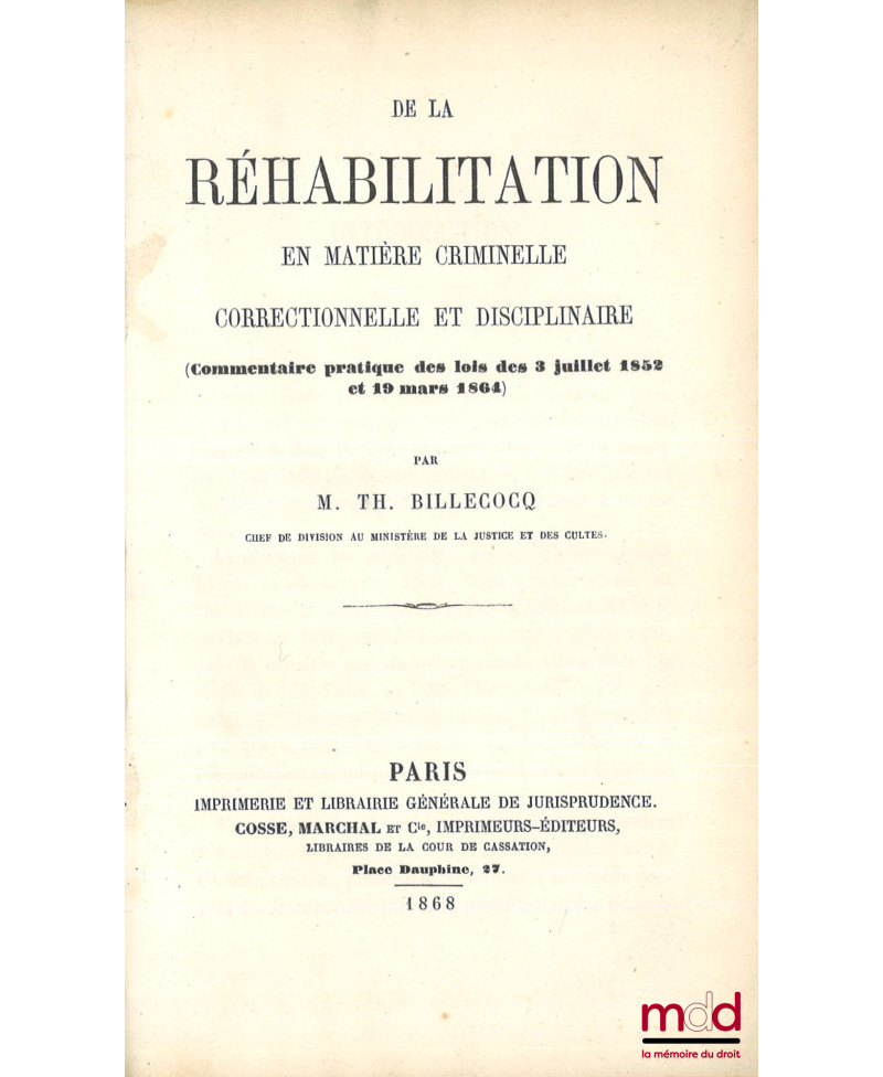 DE LA RÉHABILITATION EN MATIÈRE CRIMINELLE, CORRECTIONNELLE ET DISCIPLINAIRE, (Commentaire pratique des lois des 3 juillet 1852 et 19 mars 1864)