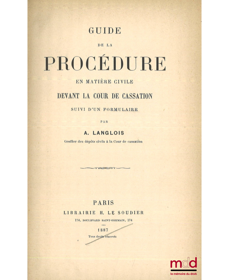 Par le greffier des dépôts civils à la Cour de cassation petit ouvrage décrivant de manière pratique la procédure devant cette juridiction, suivie d’un certain nombre de formules types (sur les significations d’avocat à avocat, sur la forme de la requête sommaire en pourvoi, etc.). Peu courant.