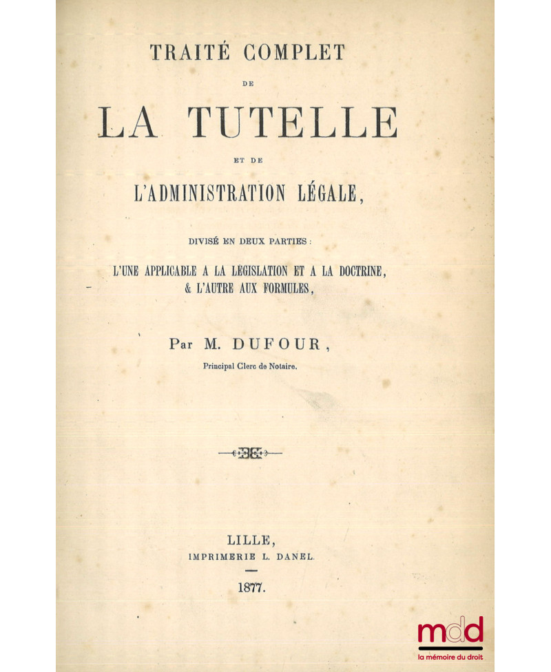 TRAITÉ COMPLET DE LA TUTELLE ET DE L’ADMINISTRATION LÉGALE, Divisé en deux parties : l’une applicable à la législation et à la doctrine & l’autre aux formules