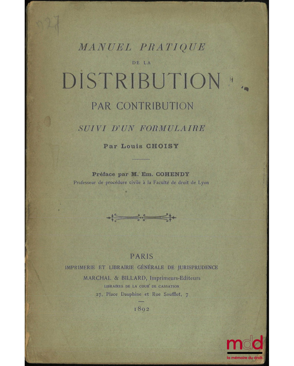 MANUEL PRATIQUE DE LA DISTRIBUTION PAR CONTRIBUTION, Suivi d’un formulaire, Préface par Em. Cohendy