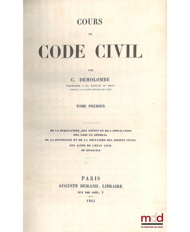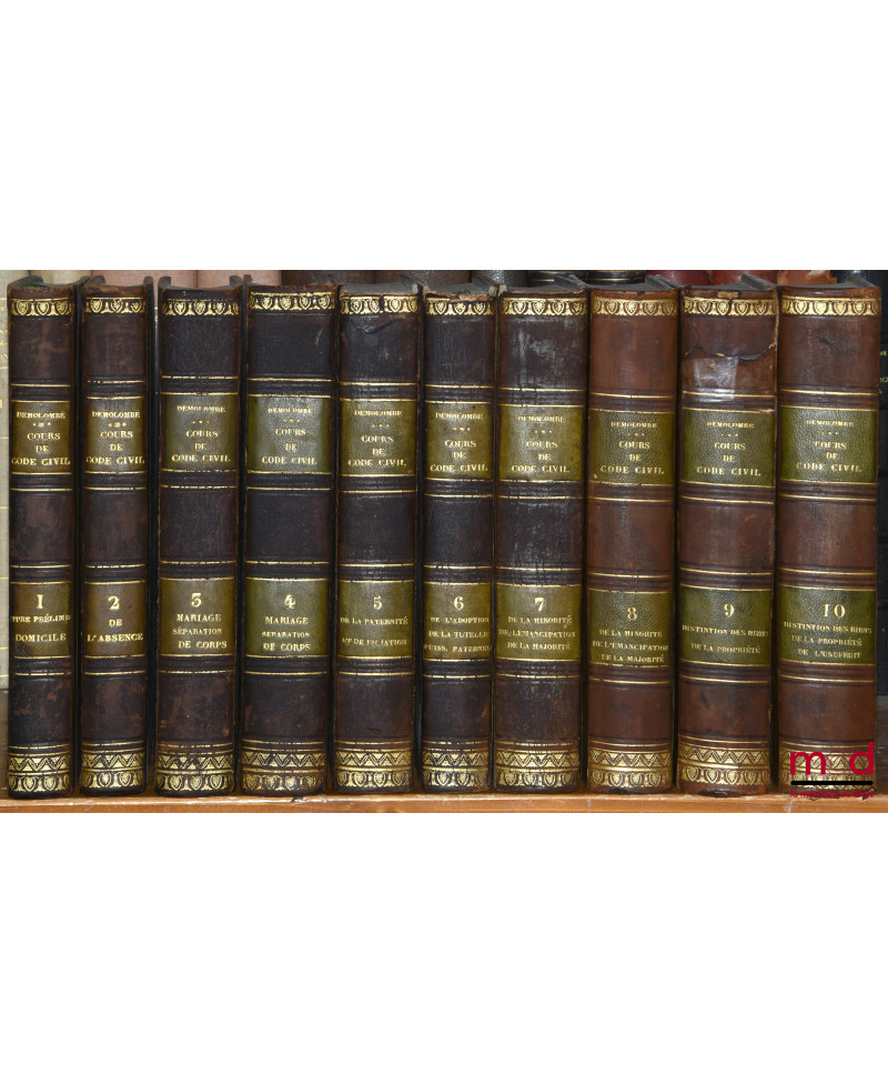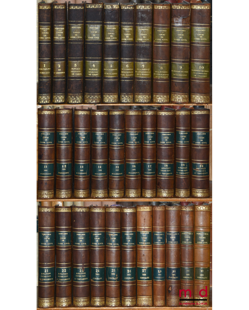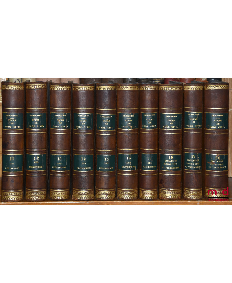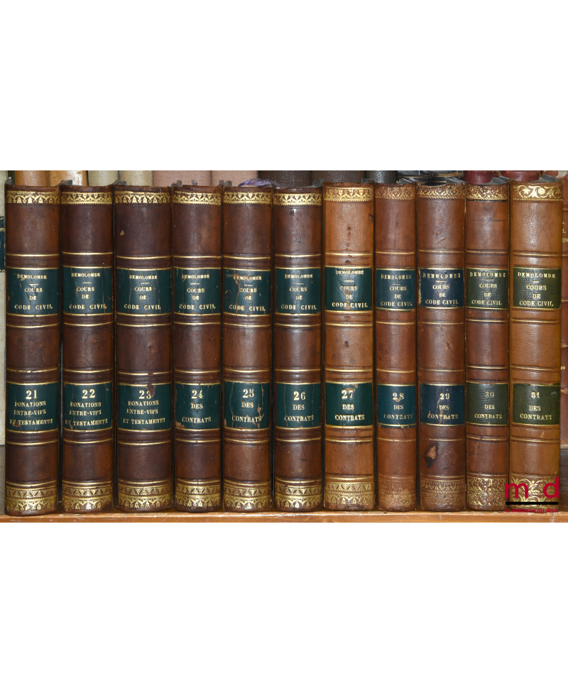 « Les textes avant tout ! Je publie un cours de Code Napoléon ; j’ai donc pour but d’interpréter, d’expliquer le Code Napoléon lui-même, considéré comme loi vivante, comme loi applicable et obligatoire ; et ma préférence pour la méthode dogmatique ne m’empêchera pas de prendre toujours pour base les articles mêmes de la loi ; car je pense, avec Ortolan, que l’enseignement des textes n’emporte pas la nécessité exclusive du commentaire. » (préf. 1re éd.) C’est dans cet esprit que D. nous livre les travaux consacrés à son analyse du Code civil et de poursuivre : "Je ne manquerai donc jamais de faire connaître l’état de la doctrine et surtout de la jurisprudence, cette partie animée, je dirais presque dramatique de la législation (...). Je revendiquerai donc l’autorité des principes partout où elle me semblerait méconnue, même lorsqu’une jurisprudence irréfragable aurait consacrée les opinions, que je ne croirais pas devoir suivre. Loin de moi pourtant la présomptueuse ambition de renverser une telle jurisprudence ! Tout en gardant ses convictions de jurisconsulte, il faut savoir, au barreau comme ailleurs, accepter les fais accomplis ; et il est dans la nature des choses non moins que dans l’intérêt public que les mêmes questions finissent par recevoir une solution irrévocable". Rarissime ensemble homogène du traité de Demolombe. Belle exemplaire malgré les défauts mentionnés.