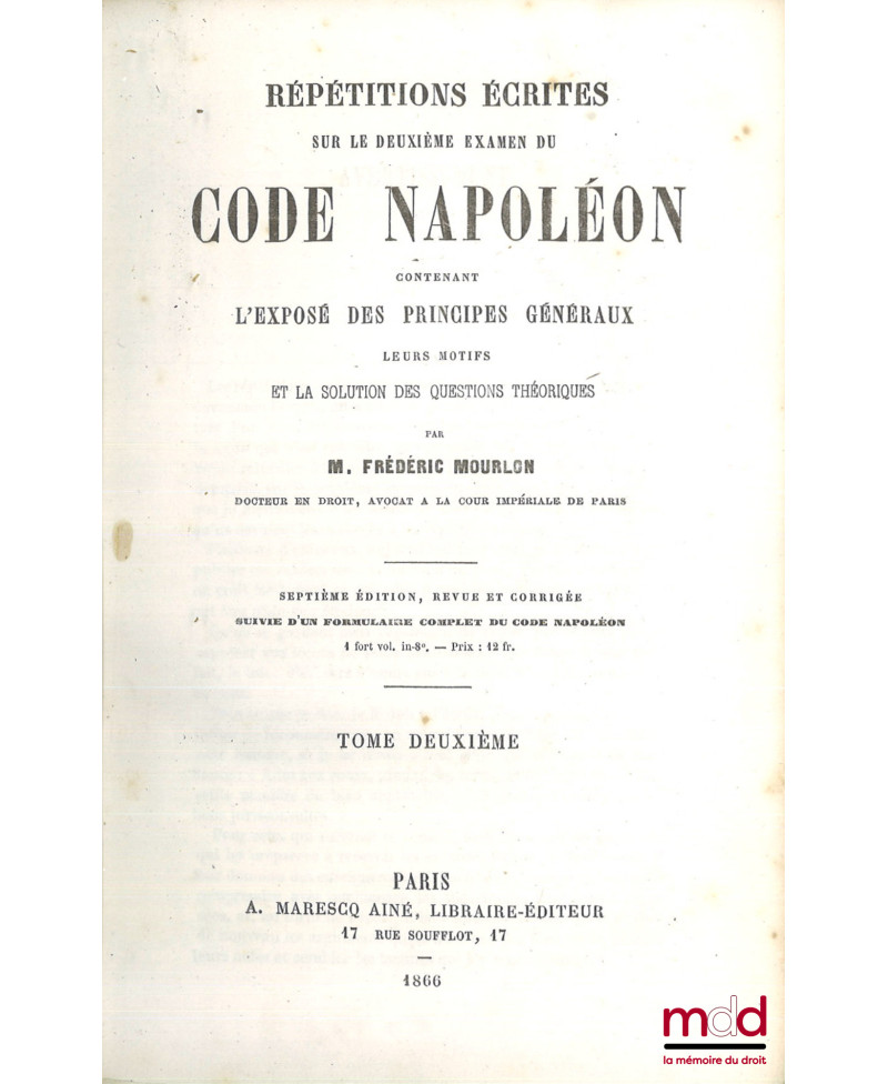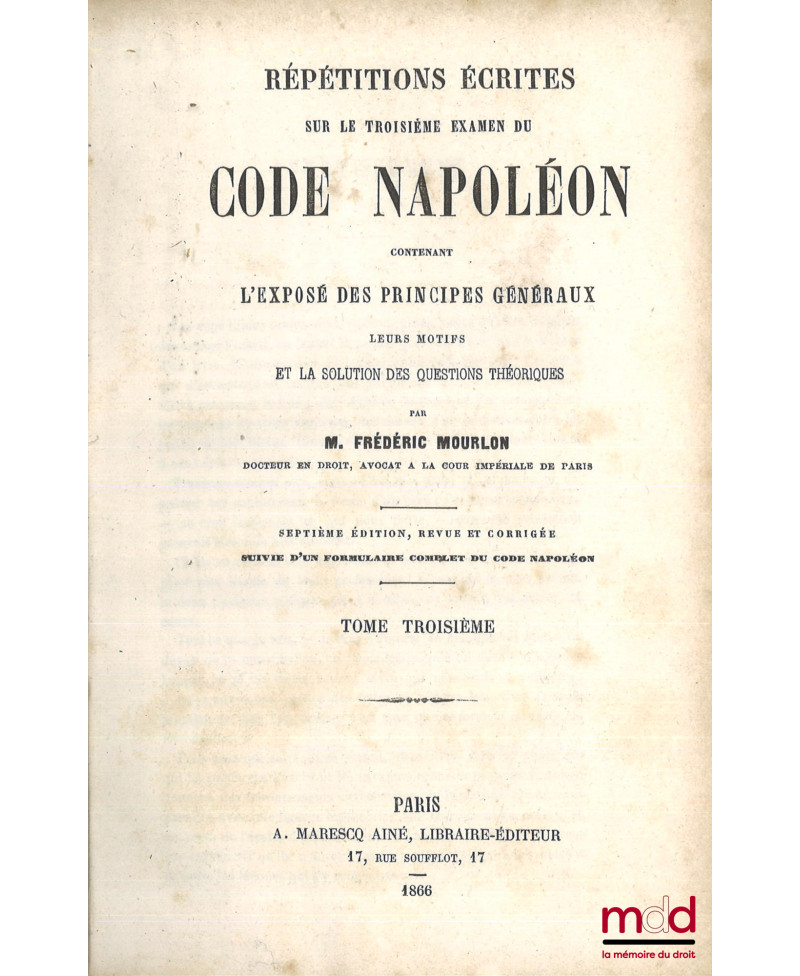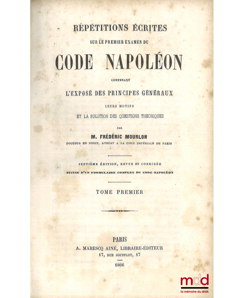 RÉPÉTITIONS ÉCRITES SUR LES TROIS EXAMENS DE CODE NAPOLÉON, CONTENANT L’EXPOSÉ DES PRINCIPES GÉNÉRAUX, LEURS MOTIFS ET LA SOLUTION DES QUESTIONS THÉORIQUES, 7e éd. revue et corrigée, Suivie d’un formulaire complet du Code Napoléon