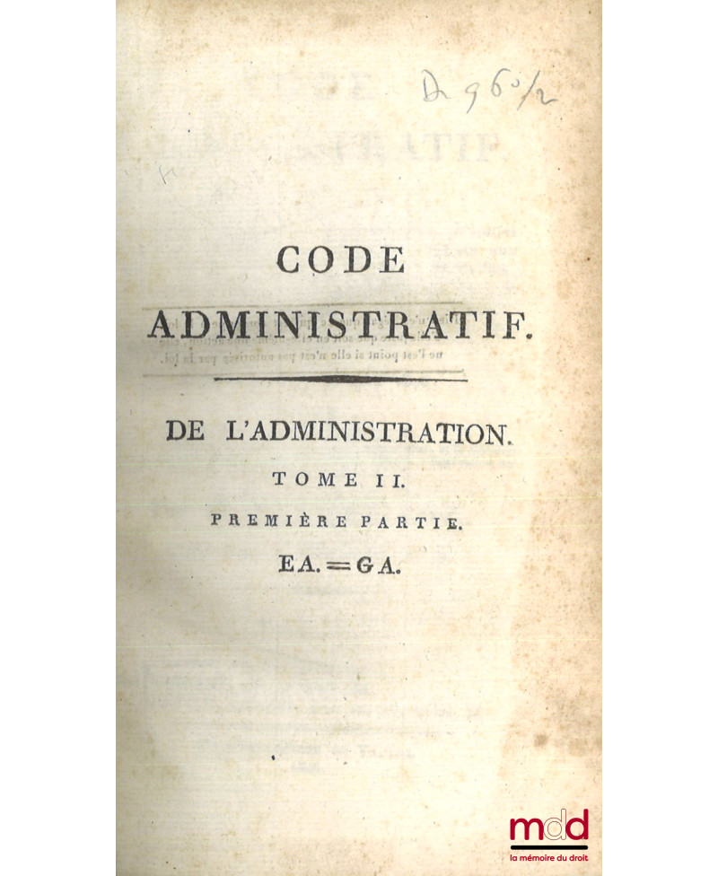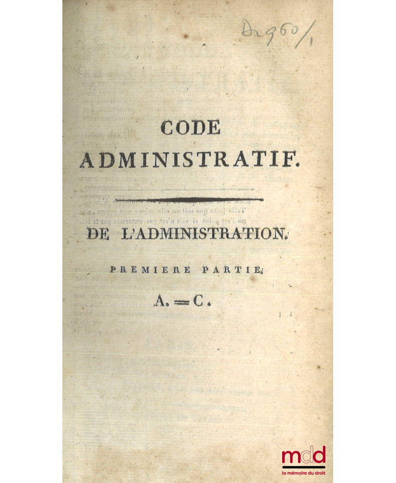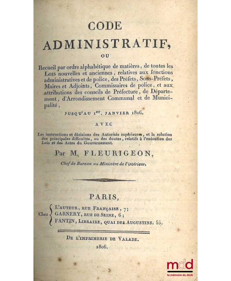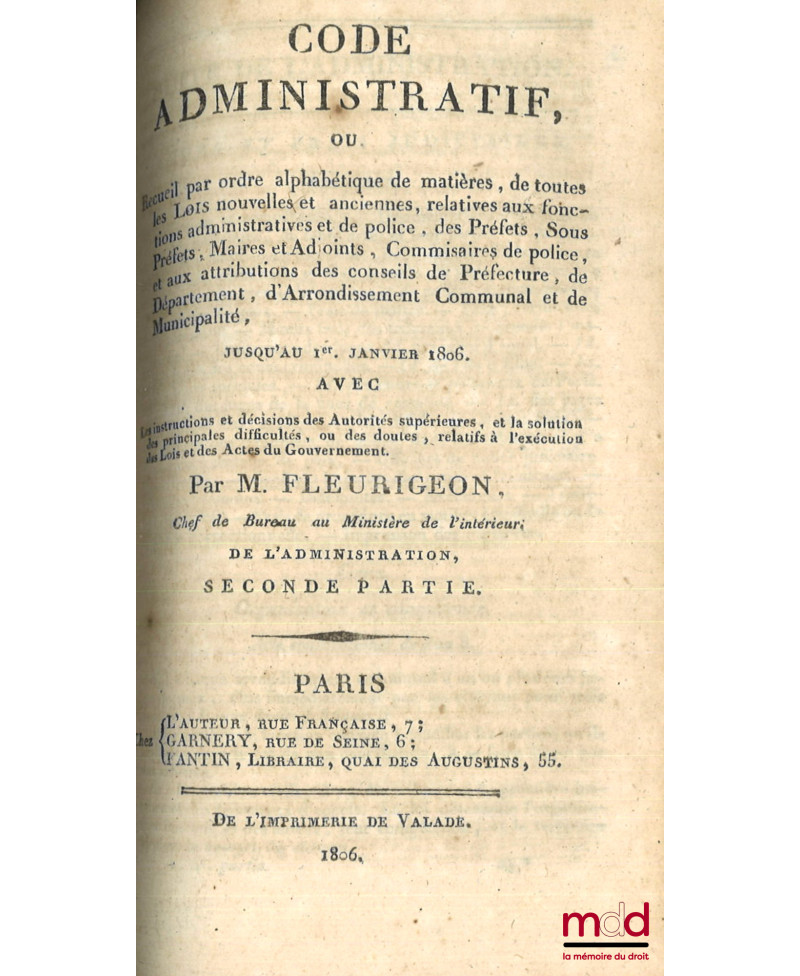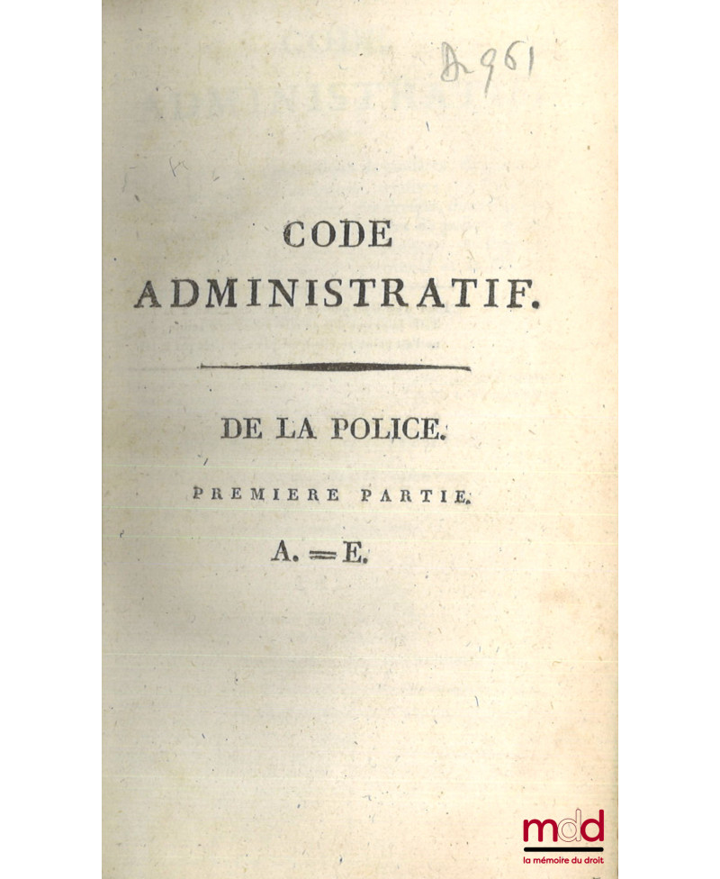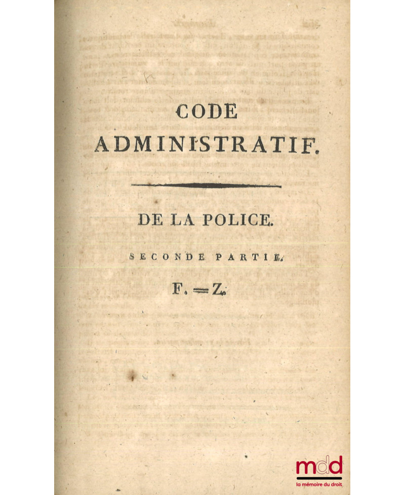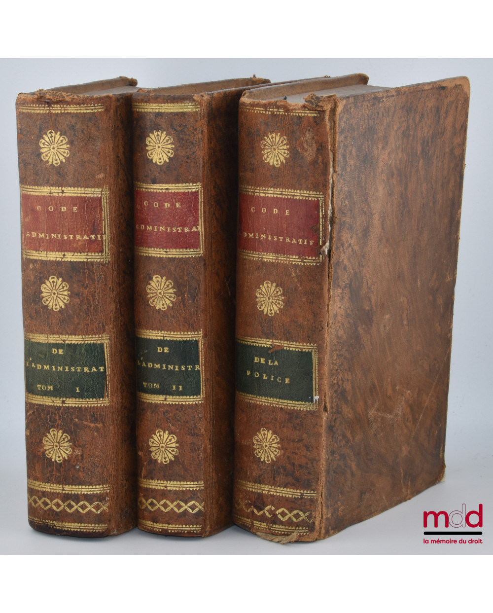 CODE ADMINISTRATIF (t. I, 1re et 2e partie - t. II, 1re partie : A. à G.) ou Recueil par ordre alphabétique de matières, de toutes les Lois nouvelles et anciennes, relatives aux fonctions administratives et de police, des Préfets, Sous-Préfets, Maires, et Adjoints, Commissaires de police, et aux attributions des Conseils de Préfecture, de Département, d’Arrondissement communal et de Municipalité jusqu’au 1er janvier 1806. Avec les instructions et décisions des Autorités supérieures, et la solution des principales difficultés, ou des doutes, relatifs à l’exécution des Lois et des Actes du Gouvernement ; [mq. 2e partie du t. II]CODE ADMINISTRATIF DE LA POLICE (t. III, 1re et 2e partie : A. à Z.)