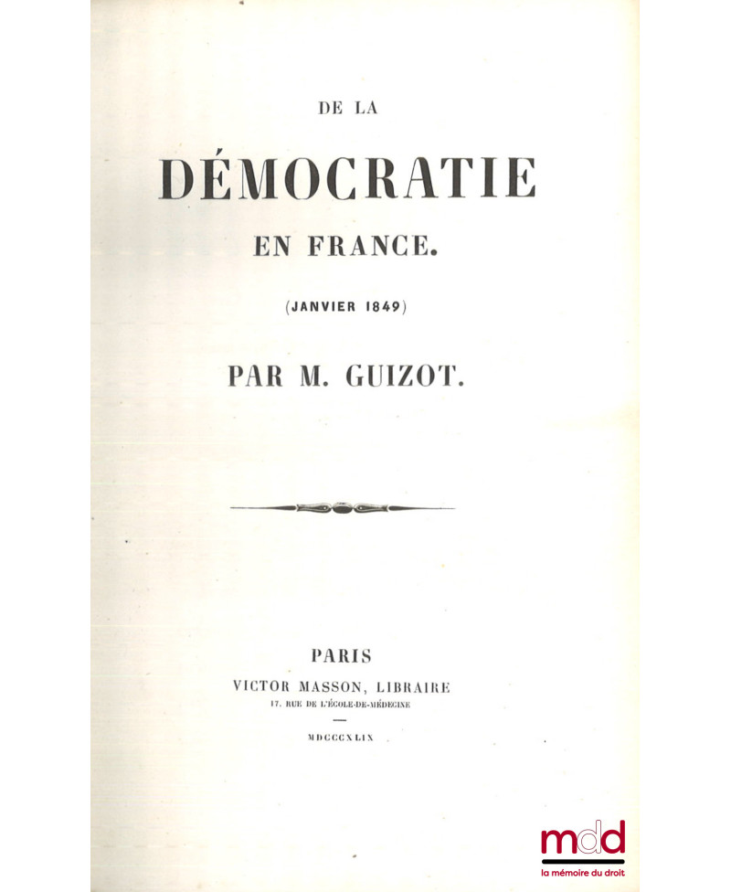 Écrit sous le coup de la Révolution de 1848 de la chute du régime orléaniste dont il fut le plus fervent soutien, l’auteur reprend la manière de ses ouvrages publiés durant la première Restauration et rédige une vigoureuse charge contre la démocratie telle que la conçoivent tant les Républicains que les défenseurs du futur régime impérial. L’écriture est toujours aussi élégante même si le propos est plus désabusé. Il s’agit de la véritable édition originale de ce texte. Rare.