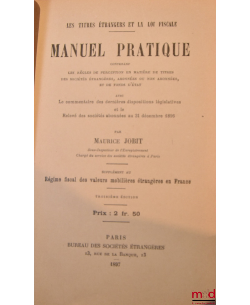 LES TITRES ÉTRANGERS ET LA LOI FISCALE - MANUEL PRATIQUE contenant les règles de perception en matière de titres des Sociétés étrangères, abonnées ou non abonnées, et de fonds d’état avec Le Commentaire des dernières dispositions législatives et le Relevé des sociétés abonnées au 31 décembre 1896. Supplément au Régime fiscal des valeurs mobilières étrangères en France, 3ème éd.