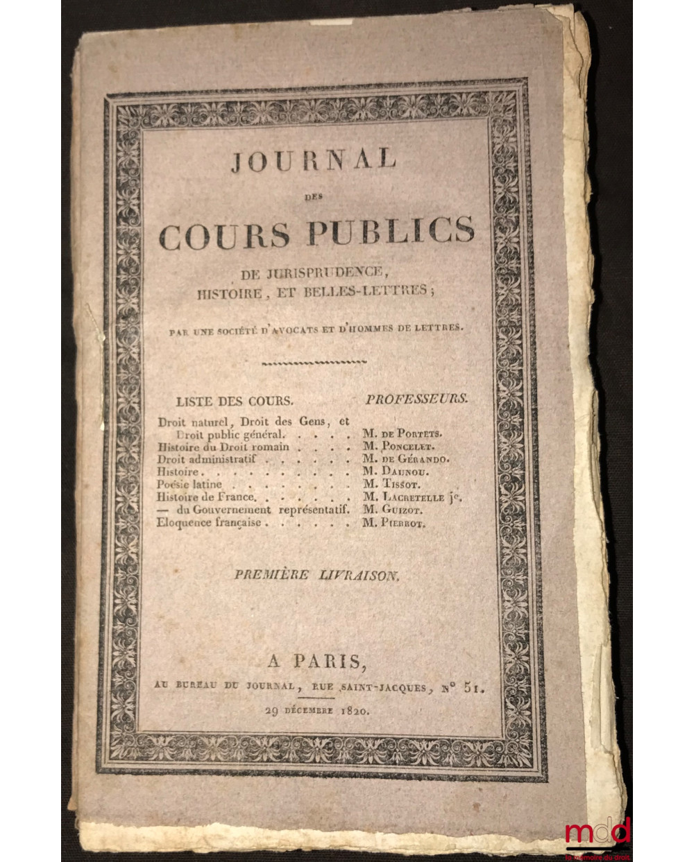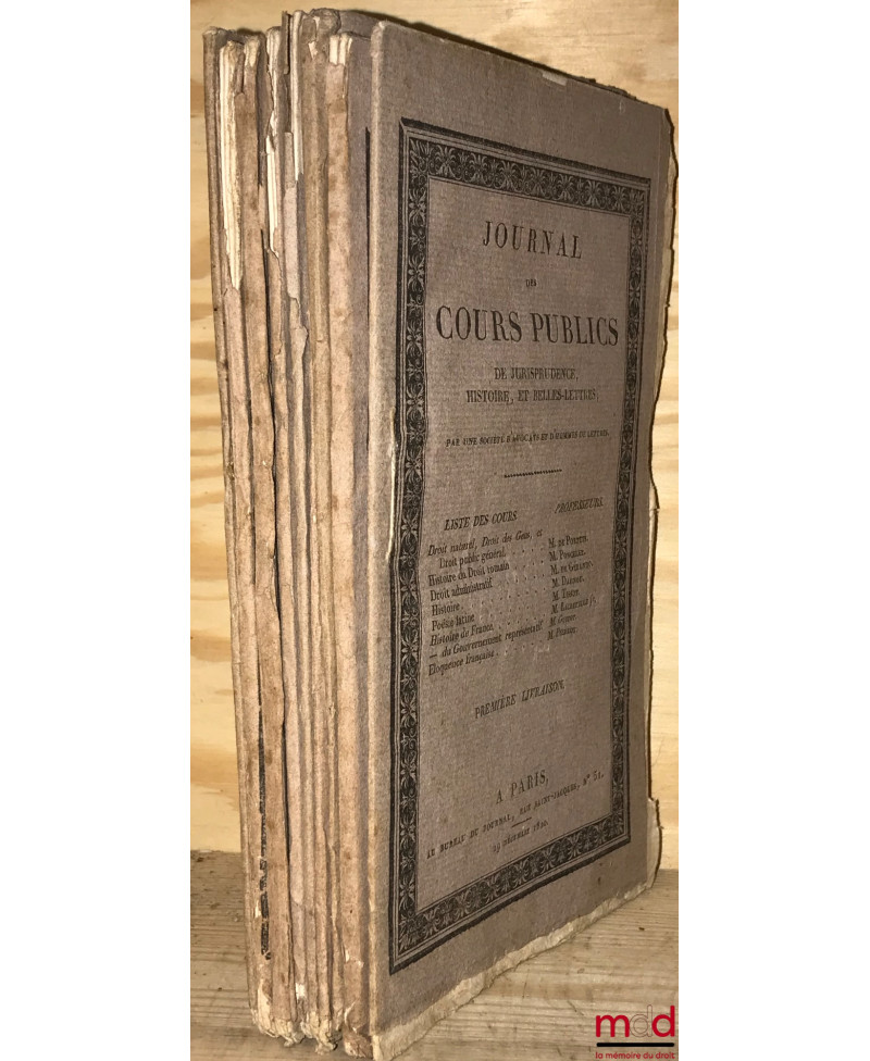JOURNAL DES COURS PUBLICS DE JURISPRUDENCE, HISTOIRE, ET BELLES-LETTRES, les 10 premières livraisons (troisième livraison manquante)