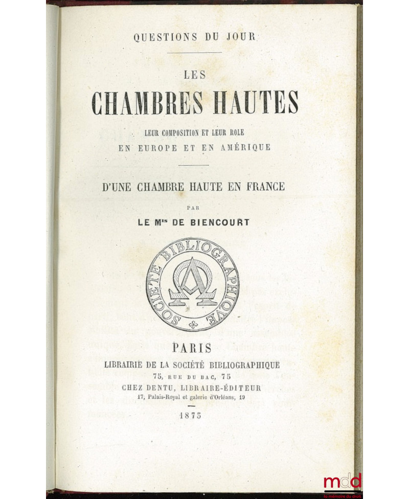 LES CHAMBRES HAUTES, LEUR COMPOSITION ET LEUR RÔLE EN EUROPE ET EN AMÉRIQUE, D’UNE CHAMBRE HAUTE EN FRANCE, coll. Questions du jour