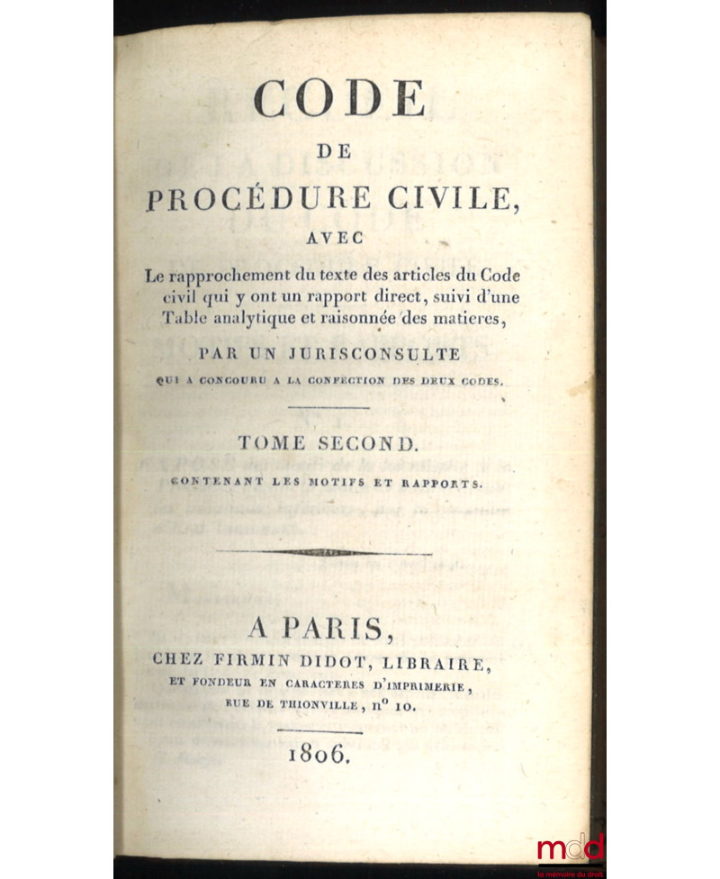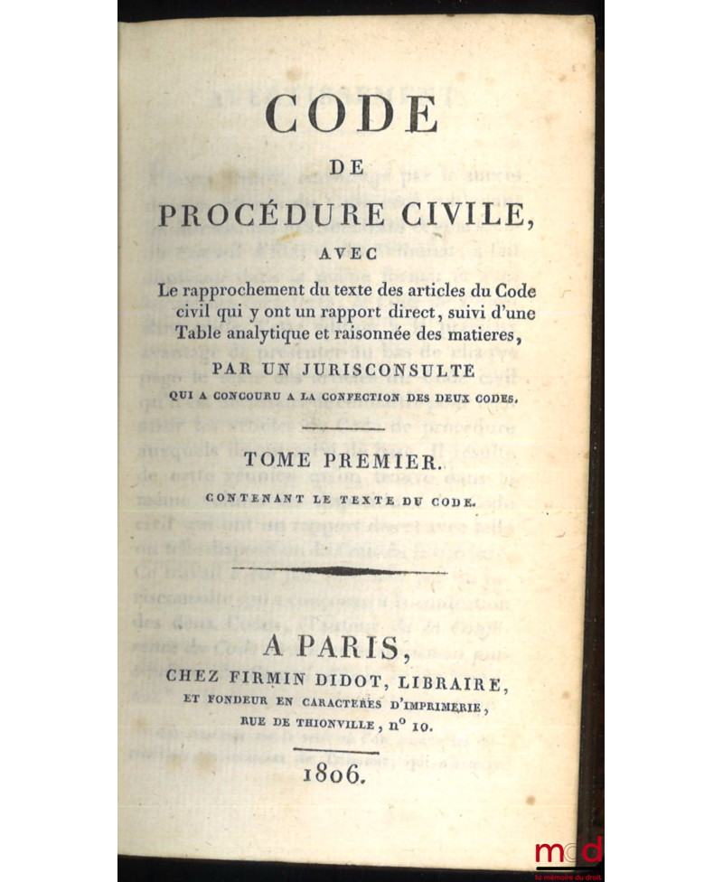 CODE DE PROCÉDURE CIVILE avec le rapprochement du texte des articles du Code civil qui y ont un rapport direct, suivi d’une Table analytique et raisonnée des matières, par un jurisconsulte qui a concouru à la confection des deux Codes