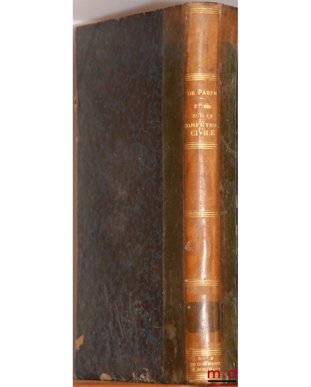 Description : in-8, demi-veau fauve, tit. doré sur dos lisse orné de quadruple filets dorés, armes “École de Commerce de Bordeaux”, tr. mouchetées, (plats frottés, dos insolé, trace d’une ancienne étiquette au bas du dos, coupes et coins émoussés), intérieur très frais, 302 p.