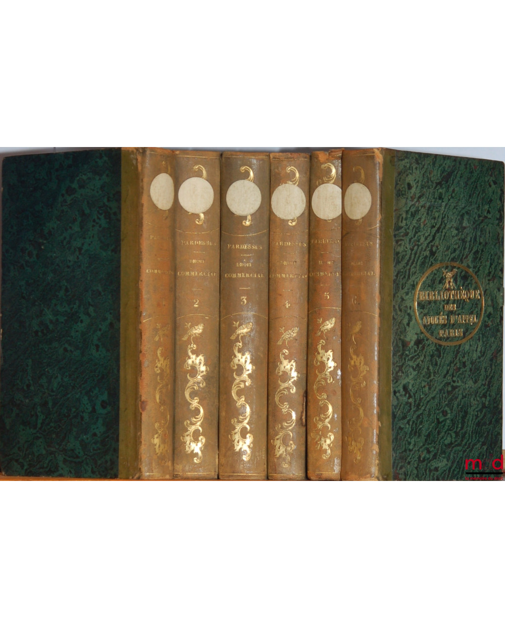- 6 vol. in-8, demi-veau vert, tit. & tom. et fleurons dorés sur dos lisses, tr. jaspées, (dos frottés, coiffe de tête lég. accidentée et épidermure de 2 cm au mors sup. du t. V, qq. piqûres et mouillures), [Cet ouvrage provient de la bibliothèque des Avoués près la cour d’appel de Paris, il peut être frappé aux armes de la Chambre des Avoués et revêtir des marques de bibliothèque].