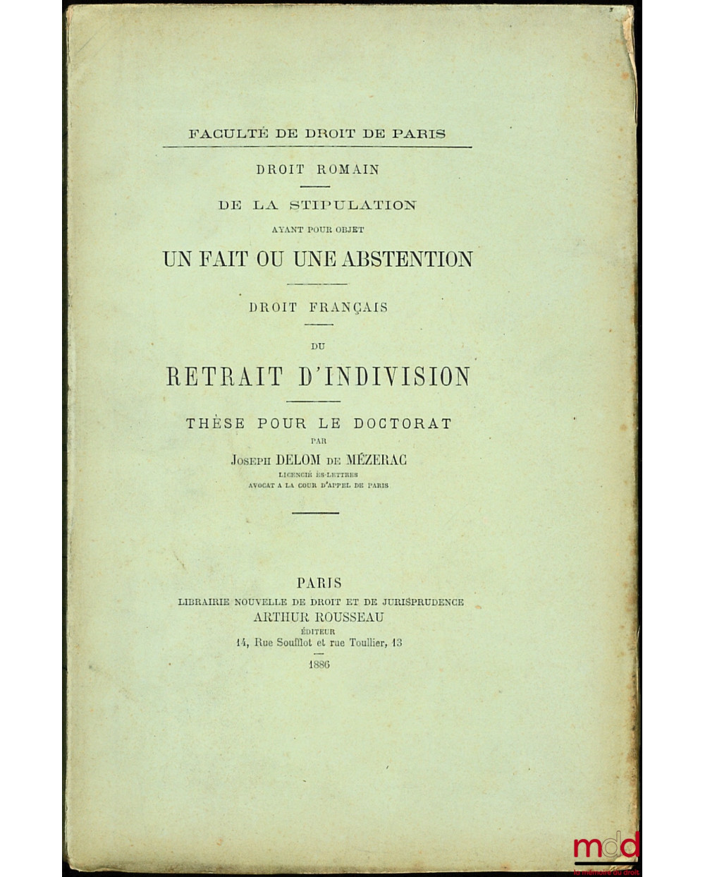 DE LA STIPULATION AYANT POUR OBJET UN FAIT OU UNE ABSTENTION (Droit romain) ; DU RETRAIT D’INDIVISION (Droit français), Thèse pour le doctorat