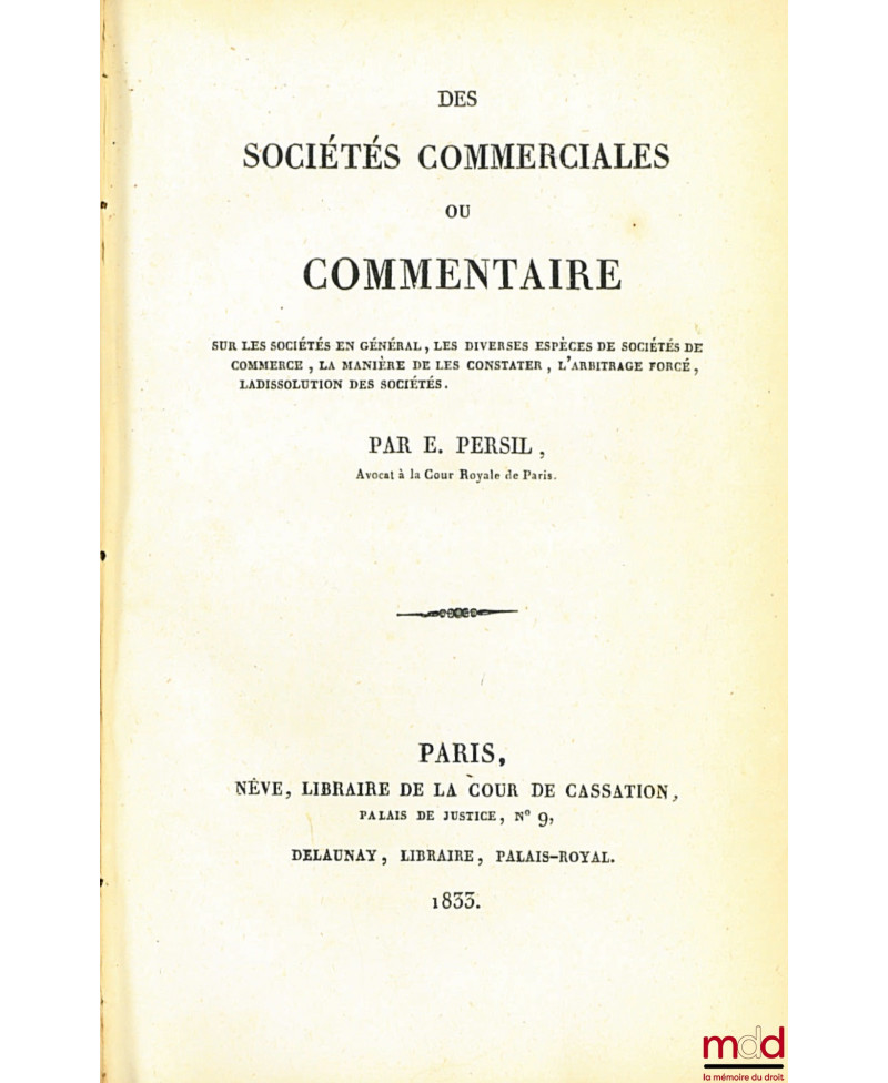 DES SOCIÉTÉS COMMERCIALES OU COMMENTAIRE SUR LES SOCIÉTÉS EN GÉNÉRAL, LES DIVERSES ESPÈCES DE SOCIÉTÉS DE COMMERCE, LA MANIÈRE DE LA CONSTATER, L’ARBITRAGE FORCÉ, LA DISSOLUTION DES SOCIÉTÉS