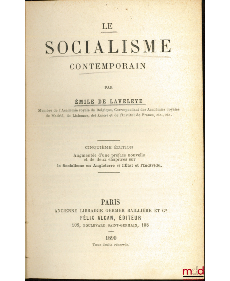 LE SOCIALISME CONTEMPORAIN, 5e éd. augmentée d’une Préface nouvelle et de deux chapitres sur le Socialisme en Angleterre et l’État et l’Individu