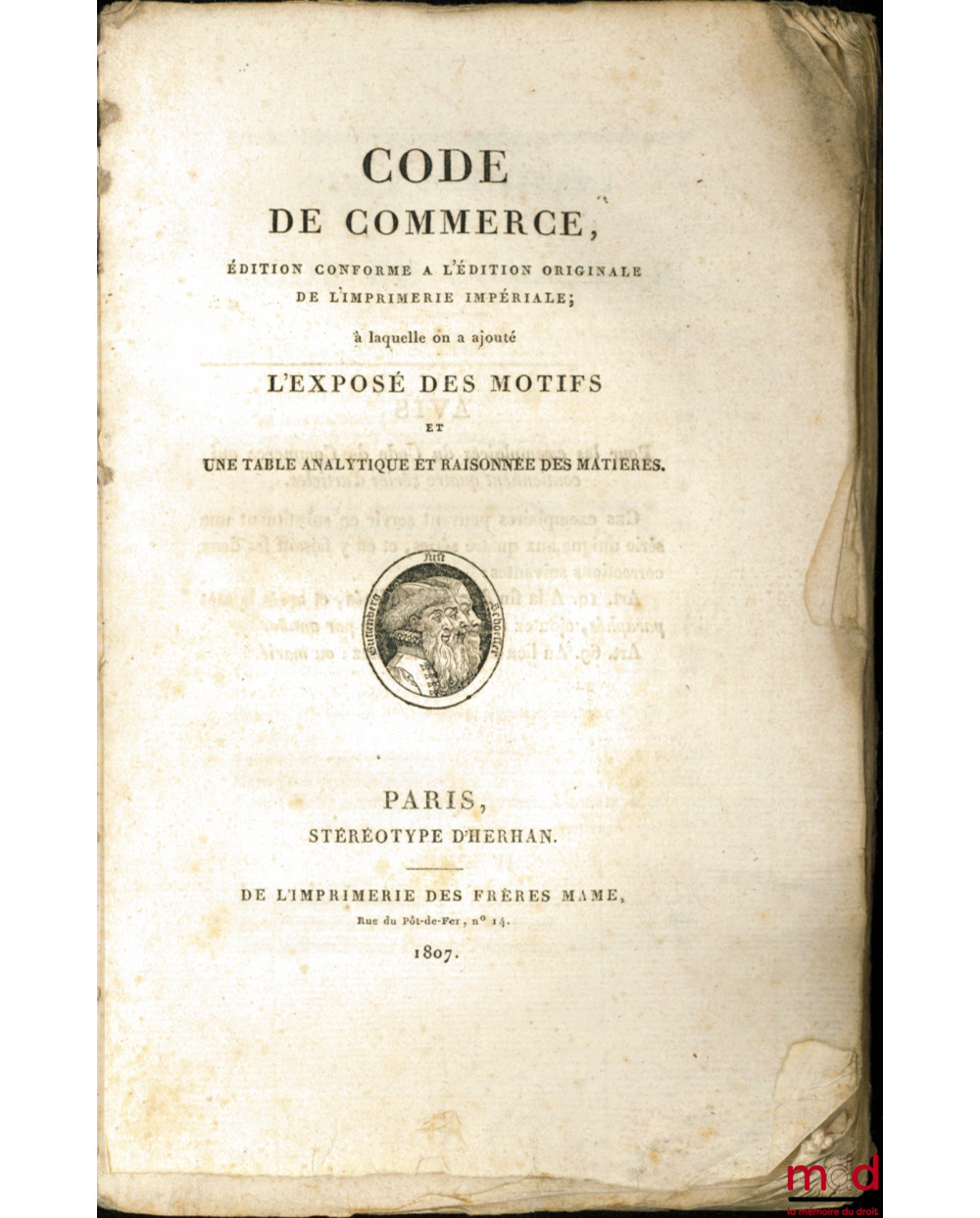 CODE DE COMMERCE, Édition conforme à l’édition originale de l’Imprimerie Impériale ; à laquelle on a ajouté l’exposé des motifs et une Table analytique et raisonnée des matières