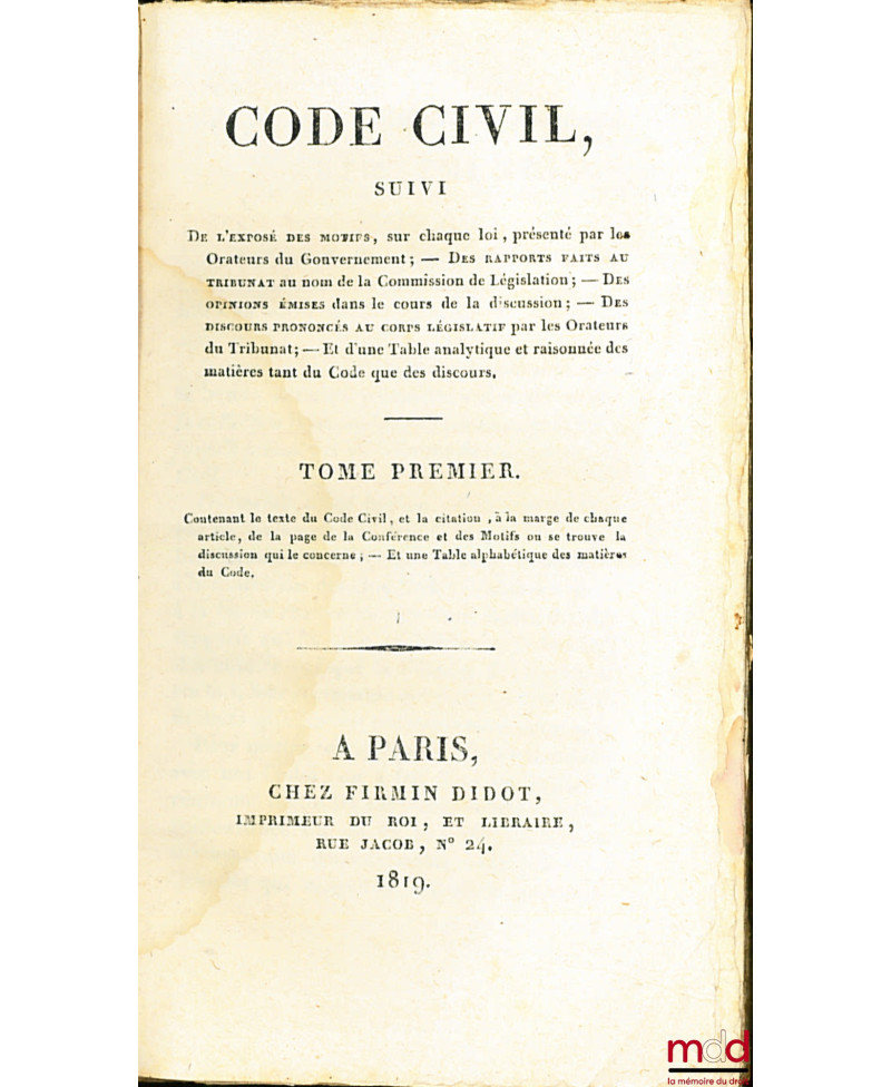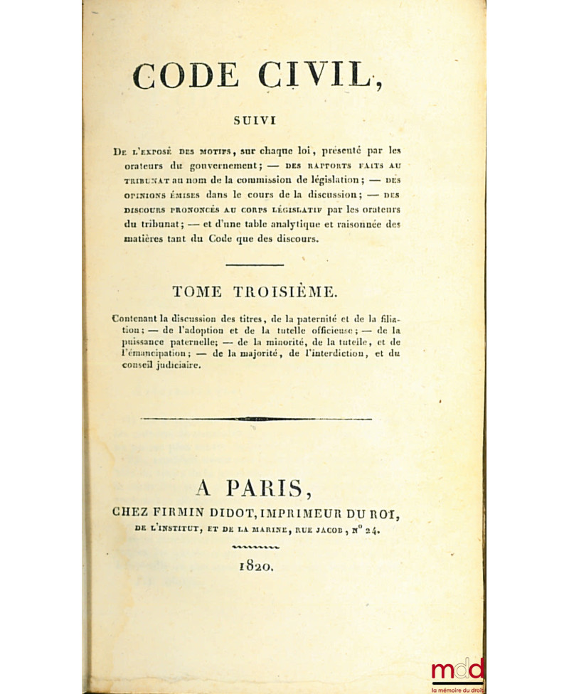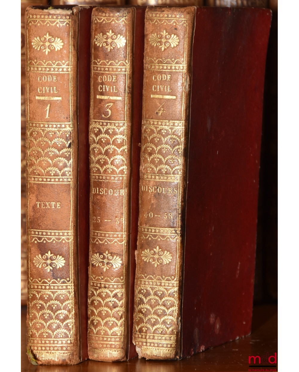 CODE CIVIL suivi DE L’EXPOSÉ DES MOTIFS, sur chaque loi, présenté par les orateurs du gouvernement ; des RAPPORTS FAITS AU TRIBUNAT au nom de la commission de législation ; DES OPINIONS ÉMISES dans le cours de la discussion ; DES DISCOURS PRONONCÉS AU CORPS LÉGISLATIF par les orateurs du tribunat ; et d’une table analytique et raisonnée des matières tant du Code que des discours, t. 1, 3 & 4 (seuls)