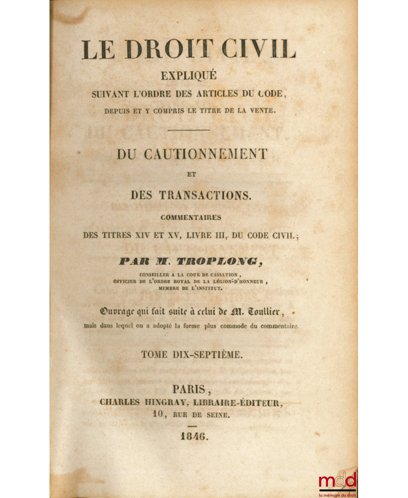 LE DROIT CIVIL EXPLIQUÉ SUIVANT L’ORDRE DES ARTICLES DU CODE : Du Cautionnement et des Transactions, Commentaires des titres XIV et XV, livre III, du Code civil