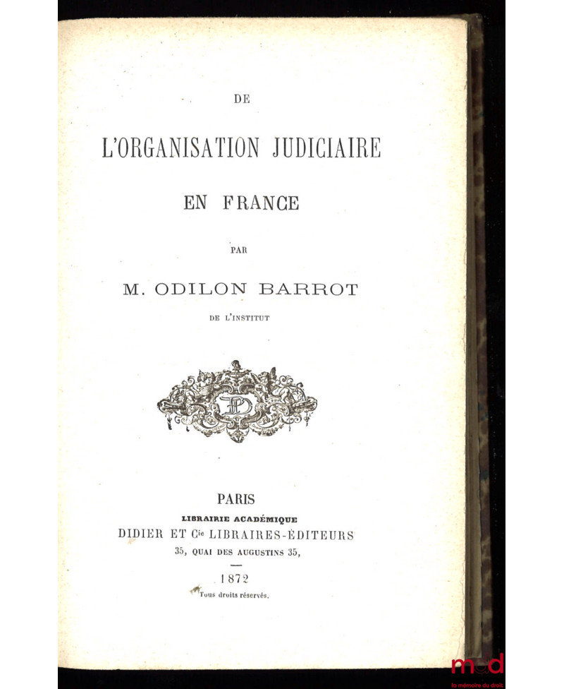 Sans doute l’ouvrage le plus important de l’auteur qui n’en publia que trois dans lesquels il résume à la fois sa pensée et ses convictions : Examen du Traité du droit pénal de M. Rossi (Paris, 1856), De la décentralisation et de ses effets (Paris, 1861), et De l’organisation judiciaire en France (Paris, 1872). Ce dernier, le plus important, est un mémoire « qui a été présenté à l’académie des sciences morales et politiques et qui a paru dans plusieurs numéros des Séances et travaux de cette institution, avant d’être publié sous la forme » que nous présentons ici. Particulièrement inspiré par le système britannique, Odilon-Barrot propose ici une généralisation du « Jury ». Il critique dans notre système à la fois la dualité de juridiction et l’existence de tribunaux administratifs trop soumis à l’influence du gouvernement. O. Barrot. est un personnage paradoxal : nommé vice-président du Conseil d’État en 1872, il fut de ceux qui organisèrent la modernisation de cette institution après le Second Empire. Pourtant, dans ce livre paru l’année précédente il se prononçait ainsi (p. 146) : « dans mon projet disparaîtrait tout le contentieux administratif des conseils de préfecture et du Conseil d’Etat ». Ce texte est d’une grande rareté.