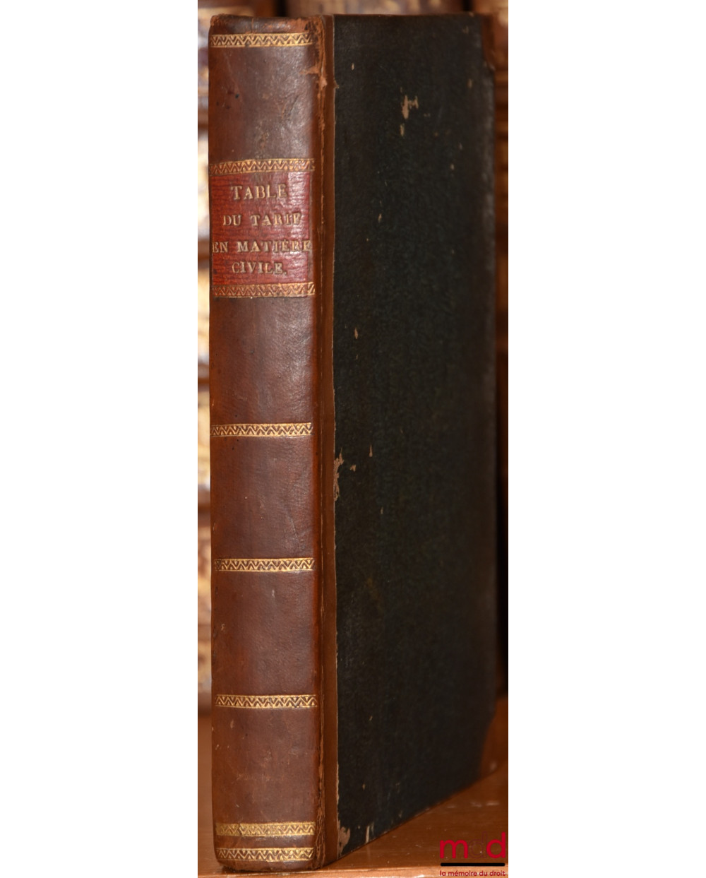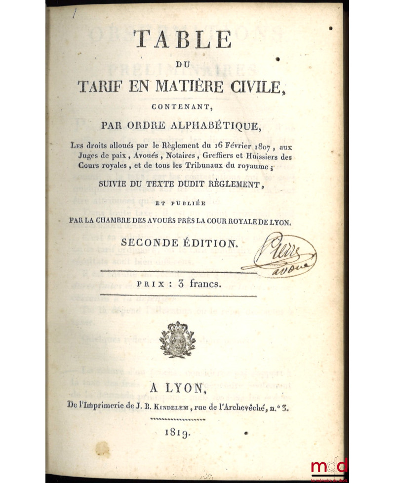TABLE DU TARIF EN MATIÈRE CIVILE, contenant, par ordre alphabétique, les droits alloués par le Règlement du 16 Février 1807, aux Juges de paix, Avoués, Notaires, Greffiers et Huissiers des Cours royales, et de tous les Tribunaux du royaume ; suivie du texte dudit Règlement, 2nde éd.