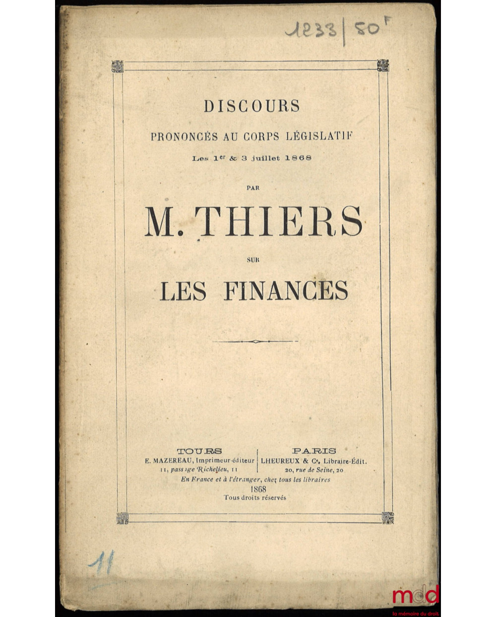Discours prononcé au Corps législatif par M. Thiers sur LES FINANCES, les 1er & 3 juillet 1868