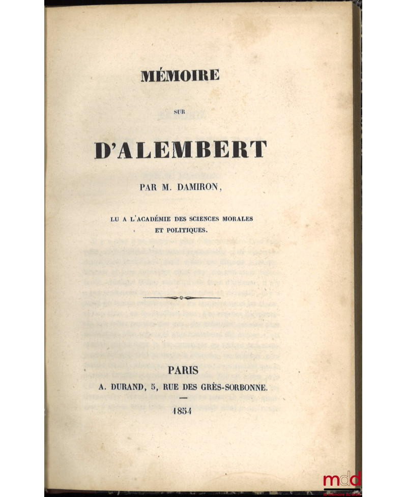 MEMOIRE SUR D’ALEMBERT, Lu à l’Académie des Sciences Morales et Politiques