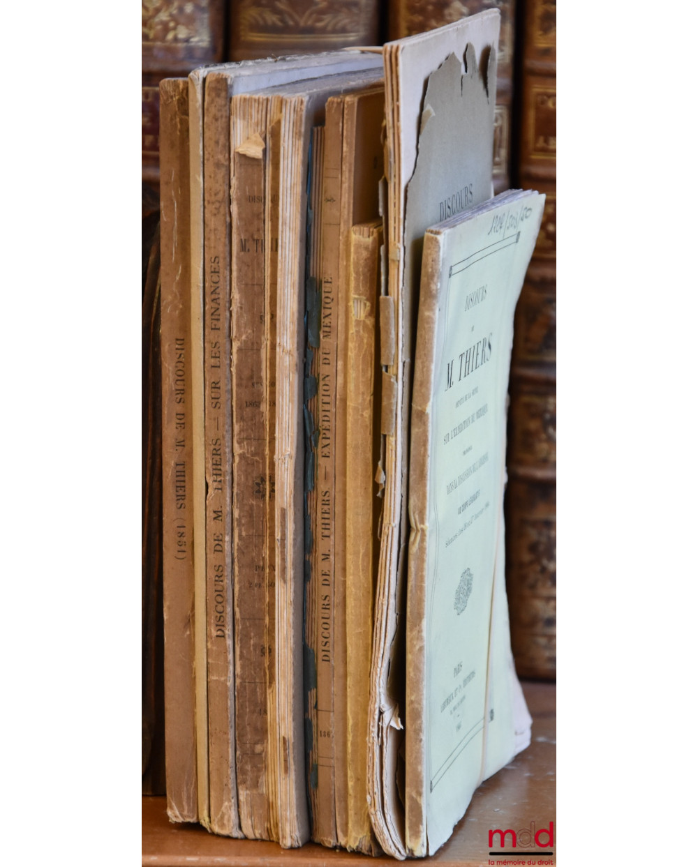 RECUEIL DE DISCOURS PRONONCÉS À L’ASSEMBLÉE NATIONALE DE ADOLPHE THIERS :1) DISCOURS PRONONCÉS PAR M. THIERS SUR LE RÉGIME COMMERCIAL DE LA FRANCE, Séance des 27 et 28 juin 1851 à l’Assemblée nationale, Paris, Paulin, Lheureux et Cie 1851, in-8, ff. non massicoté, (couv. fanée), intérieur frais, XLVIII-144 p.2) DISCOURS DE M. THIERS SUR L’EXPÉDITION DU MEXIQUE, prononcé dans la discussion de l’adresse au Corps législatif, séances des 26 & 27 janvier 1864, Paris, Lheureux & Cie 1864, in-8, br., non massicoté, ENVOI DE L’AUTEUR, (couv. fanée, feuilles lég. jaunies), intérieur frais, [2 ff.]-82 p.3) DISCOURS PRONONCÉS PAR M. THIERS, dans la Session 1963-1864, sur :LA DETTE FLOTTANTE,LES LIBERTÉS NÉCESSAIRES À LA FRANCE,LES CANDIDATURES OFFICIELLES,L’EXPÉDITION DU MEXIQUE,LA MARINE MARCHANDE,et LES FINANCES DE LA FRANCE, Paris, Lheureux & Cie 1864, in-8, br. non massicoté, présence d’un feuillet exposant une « Comparaison du Budget définitif de 1851 et du Budget proposé pour 1865 », (dos cassé, exemplaire désolidarisé en 3 parties, rousseurs), intérieur frais, [2 ff.]-326-[2 ff.] p.4) DISCOURS DE M. THIERS SUR LA QUESTION ROMAINE, prononcés les 13 et 15 avril 1865, Paris, Lheureux & Cie 1865, in-8, br., non massicoté, (couv. fanée, feuilles lég. jaunies), intérieur frais, [2 ff.]-117 p.5) DISCOURS SUR LES LIBERTÉS POLITIQUES PRONONCÉ PAR M. THIERS AU CORPS LÉGISLATIF, dans la séance du 28 mars 1865, Paris, Lheureux & Cie 1865, in-8, br., non massicoté, (couv. fanée, feuilles lég. jaunies), intérieur frais, [2 ff.]-48 p.6) DISCOURS DE M. THIERS SUR L’EXPÉDITION DU MEXIQUE, prononcés au Corps législatif dans les séances des 9 & 10 juillet 1867, Paris, Lheureux & Cie 1867, in-8, br., non massicoté, (couv. fanée, feuilles lég. jaunies), intérieur frais, [2 ff.]-86 p.7) DISCOURS DE M. THIERS SUR LES FINANCES, Prononcé au Corps Législatif les 1er & 3 juillet 1868, Tours / Paris, Ernest Mazereau / Lheureux & Cie 1868, in-8, ff. non massicoté, (couv. fanée), intérieur frais, [2 ff.]-140 p.8) DISCOURS DE M. THIERS SUR L’ADMINISTRATION DE LA VILLE DE PARIS, Prononcé au Corps Législatif le 24 février 1869, Tours, Ernest Mazereau 1869, in-8, ff. non massicoté, (couv. fanée), intérieur frais, [2 ff.]-82-[1 ff.] p.9) DISCOURS PRONONCÉ PAR M. THIERS, DISCUSSION DU PROJET DE LOI RELATIF À UN EMPRUNT DE 2 MILLIARDS, Séance du 20 juin 1871, Paris, A. Wittersheim & Cie 1871, in-8, ff. relié, (couv. fanée, feuilles lég. jaunies), intérieur frais, 76 p.10) DISCOURS CONTRE L’ÉTABLISSEMENT D’UN IMPÔT SUR LE REVENU PRONONCÉ PAR M. THIERS le 26 décembre 1871 à l’Assemblée nationale, Paris, Calmann Lévy 1896, in-8, br., non massicoté, (couv. fanée avec mq., dos dont il reste une partie résiduelle, feuilles jaunies), intérieur frais, 54 p.