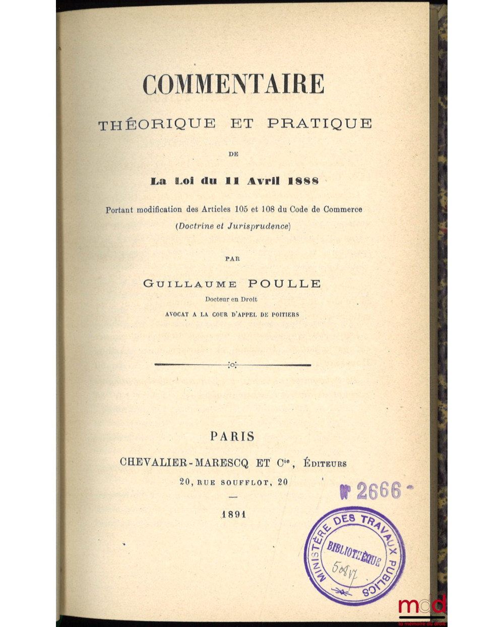 Description : in-8, demi-chagrin marron, tit. doré sur dos à 5 nerfs, nerfs ornés de roulette dorée, motifs floraux, roulettes et filets dorés soulignant les caissons et coiffes, au chiffre de M.T.P. [Ministère des Travaux Publics], (coins lég. émoussés, marques de bibl.), bon état malgré les défauts soulignés, VIII-176 p.