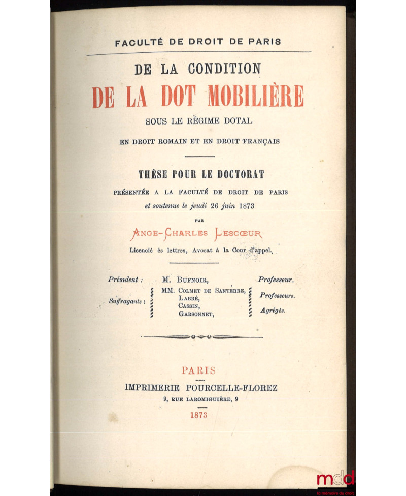 DE LA CONDITION DE LA DOT MOBILIÈRE SOUS LE RÉGIME DOTAL EN DROIT ROMAIN ET EN DROIT FRANÇAIS, Thèse pour le doctorat présentée à la faculté de droit de Paris et soutenue le jeudi 26 juin 1873, Président : Bufnoir ; Suffragants : Colmet de Santerre, Labbé, Cassin, Garsonnet